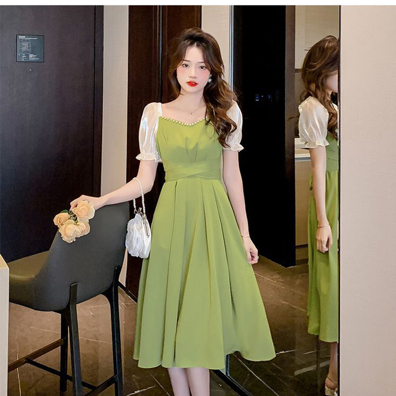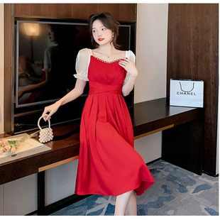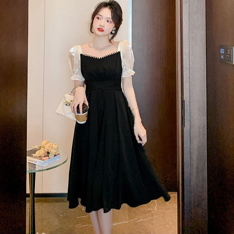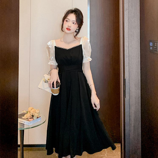 抖音质量夏季 网纱拼接名媛气质方领系带收腰显瘦连衣裙女胖MM 新款