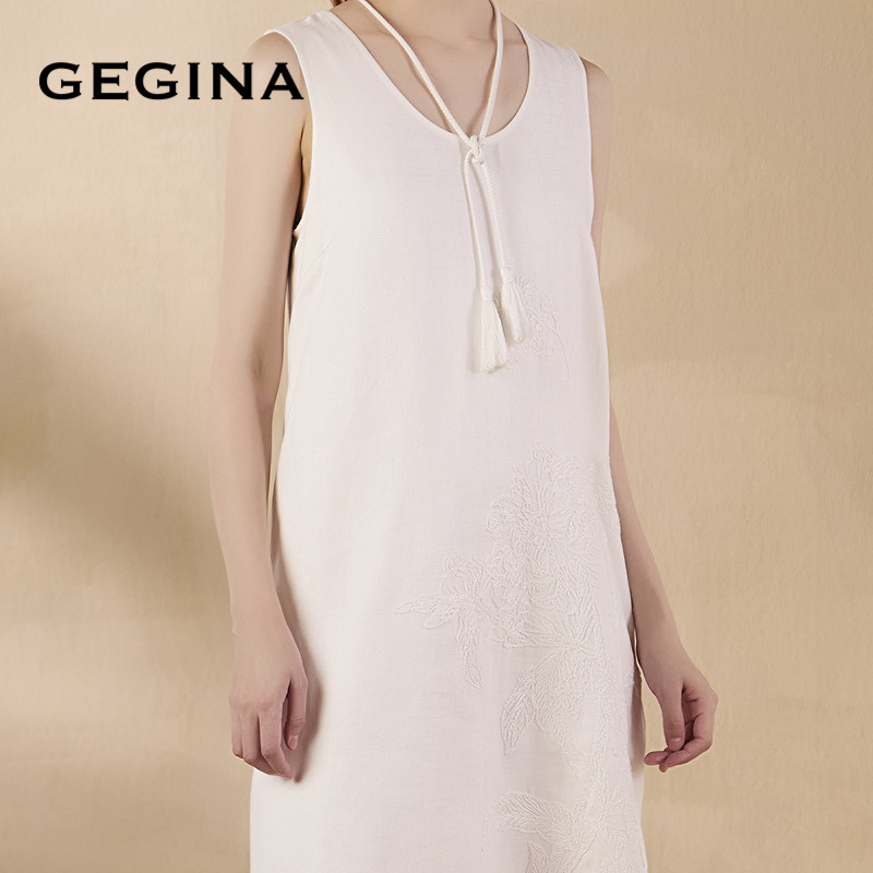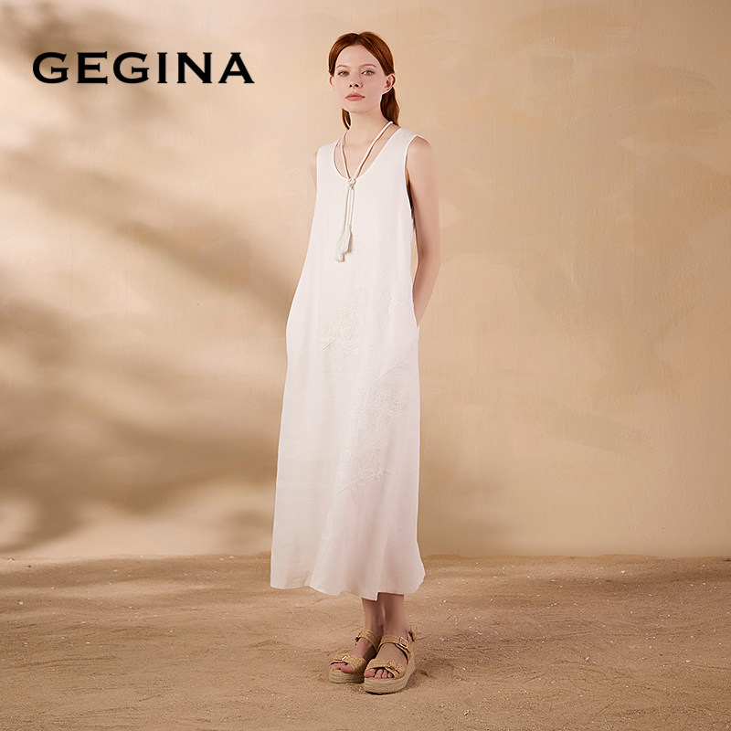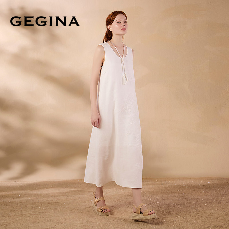亚麻 纯色连衣裙长款 GEGINA吉吉娜春夏季 无袖 仙气优雅裙 新品