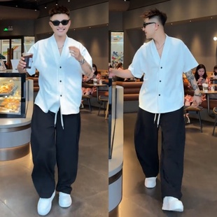 男士 极简风V领竖纹肌理感休闲套装 短袖 开衫 两件套 夏季 休闲裤 新款