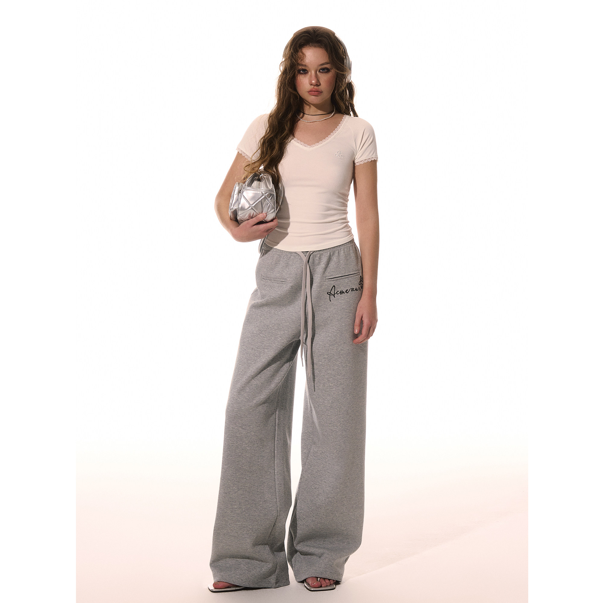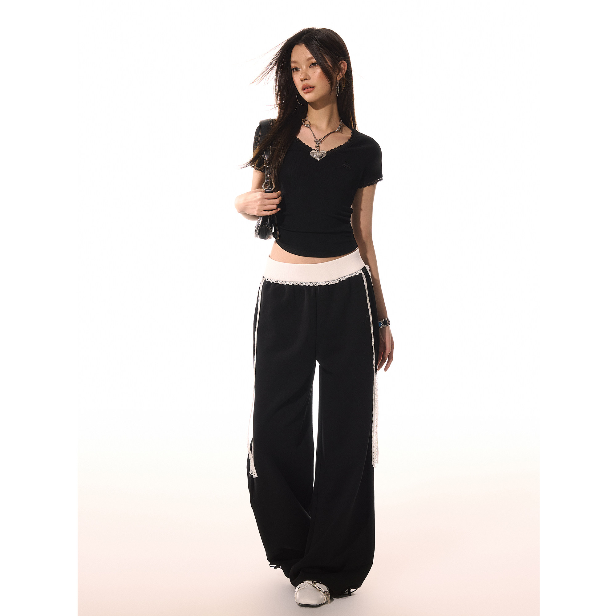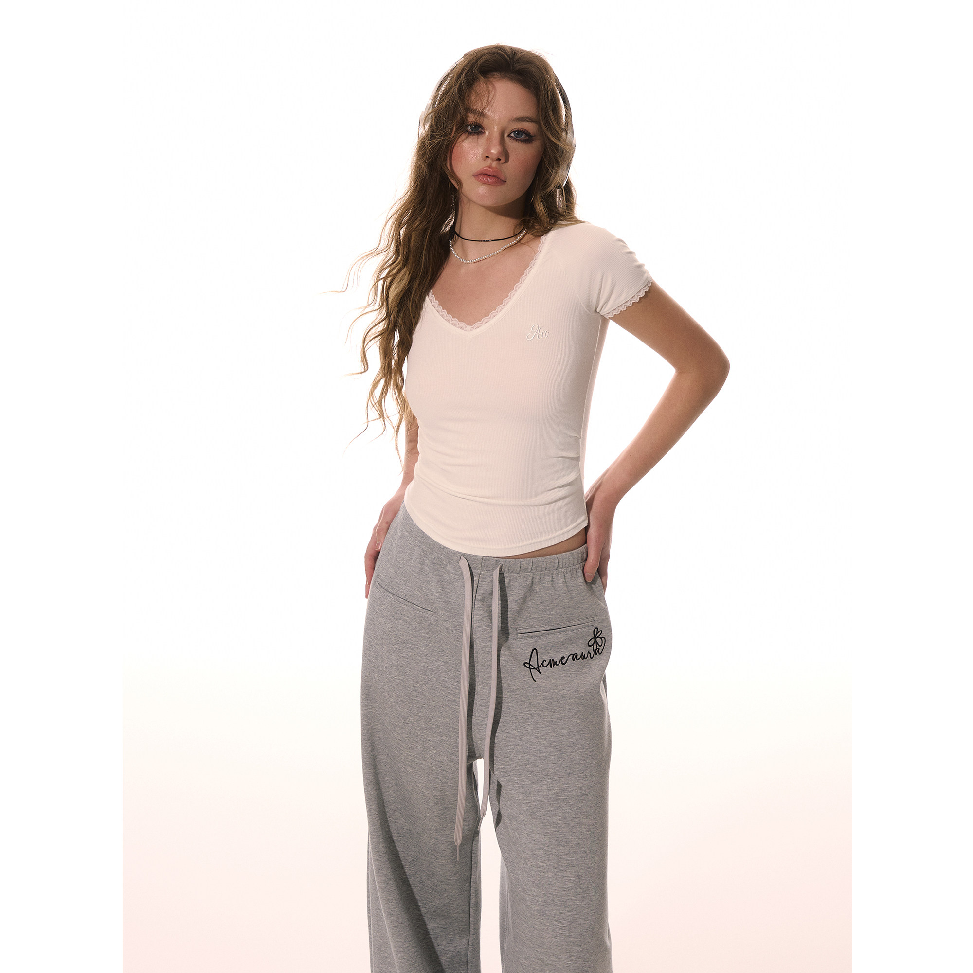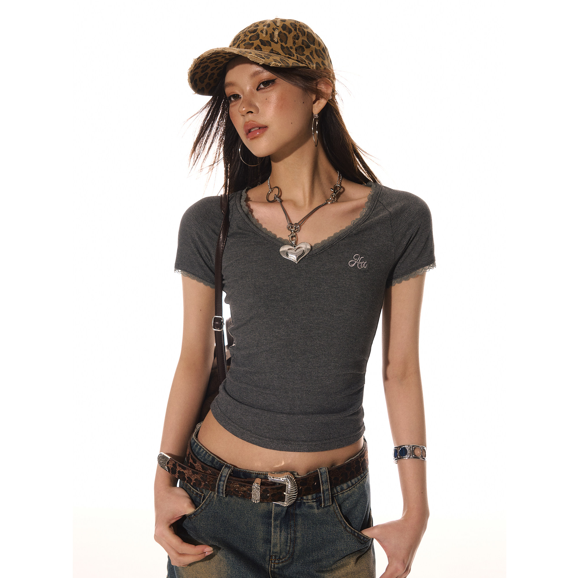 上衣 设计感掐腰收褶显瘦纯欲短袖 ACMEAURA蕾丝花边V领修身 T恤夏季
