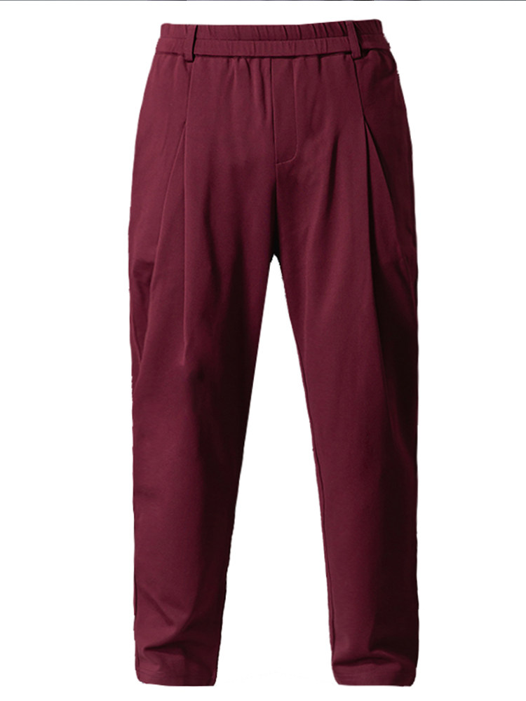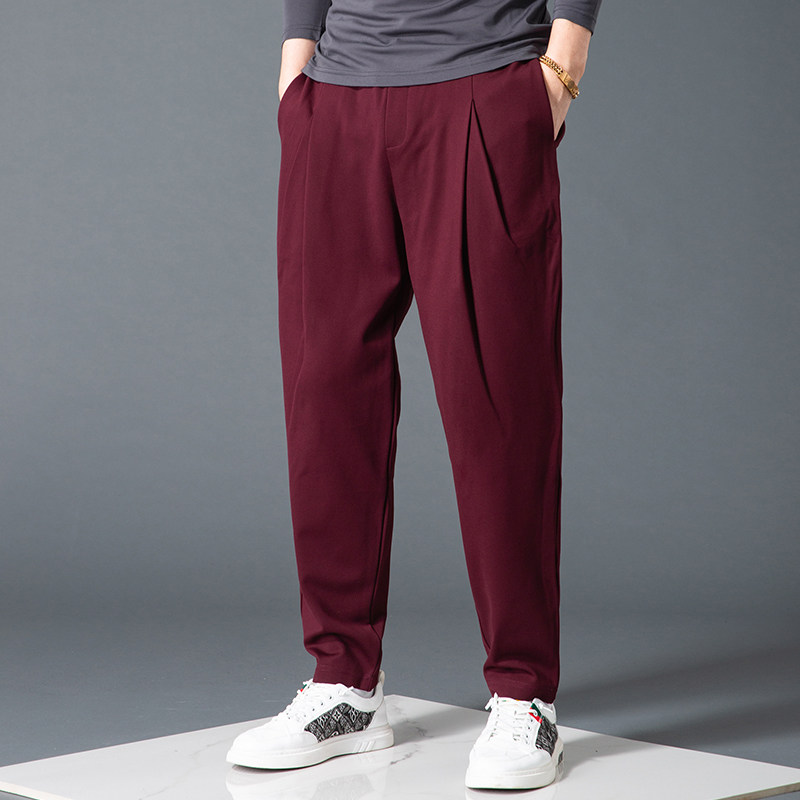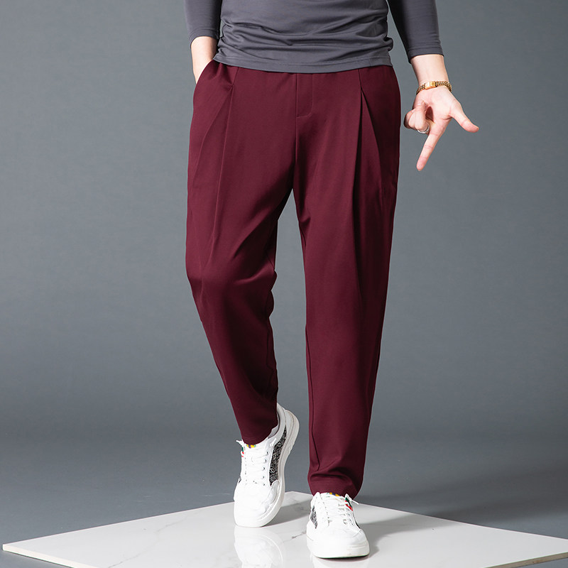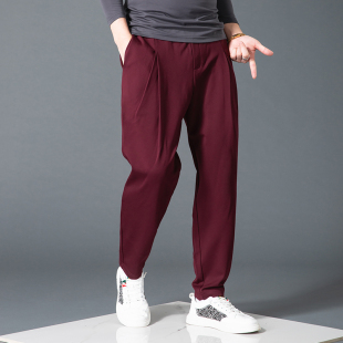 潮流百搭纯色弹力运动哈伦裤 休闲裤 男小脚垂感九分酒红色宽松韩版
