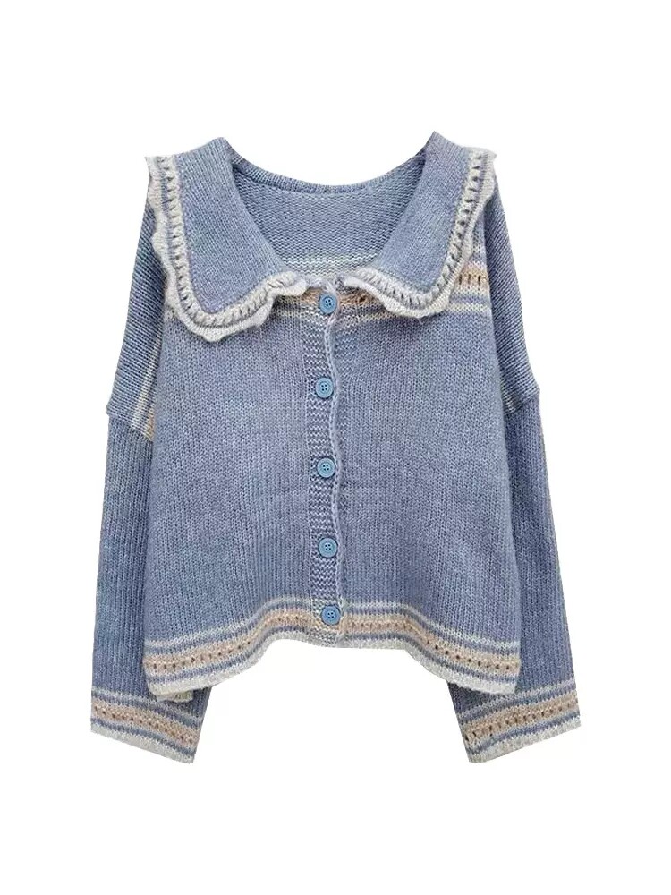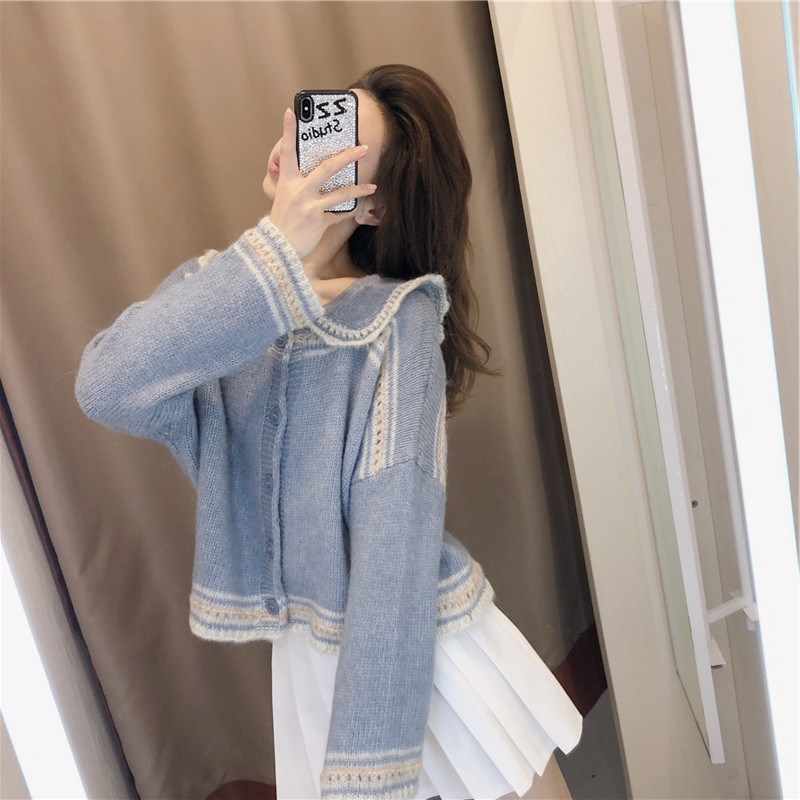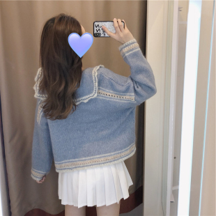 春季 森系慵懒海军领毛衣女蓝色上衣娃娃领针织衫 女装 大码 外套秋装