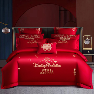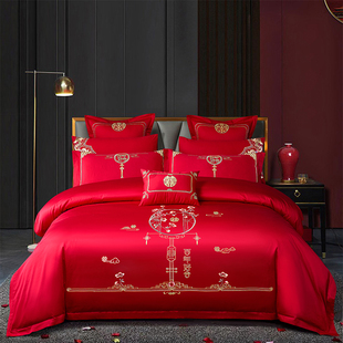 高端婚庆四件套大红全棉刺绣喜被套床单结婚房嫁礼房床上用品欧式