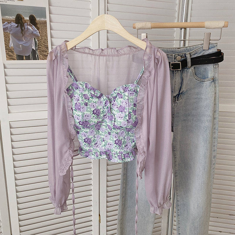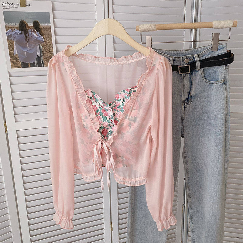 网纱小防晒衫 荷叶边碎花系带长袖 外套女 剪镖外贸折扣女装 捡漏特价