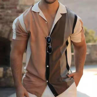 Casual Men Lapel Loose Striped Shirt条纹休闲衬衫 Colorblock