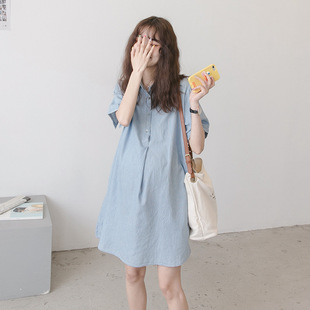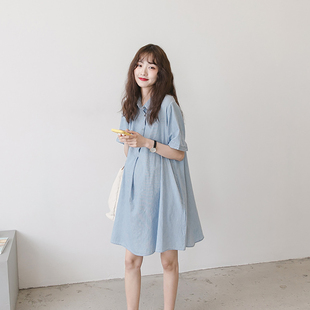 纯棉小个子可哺乳衬衫 清新蓝 连衣裙条纹宽松薄款 短袖 裙 孕妇夏装
