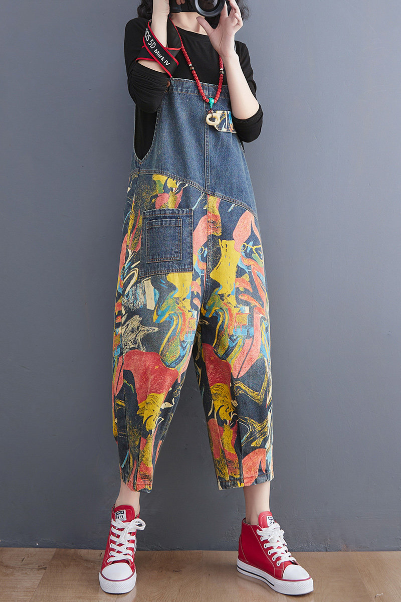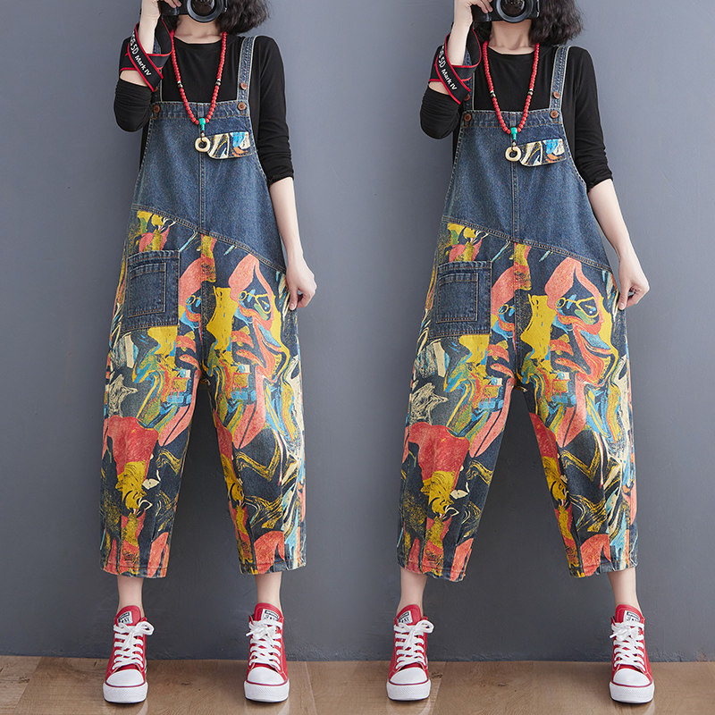 女胖mm200斤宽松显瘦印花七分连体裤 牛仔背带裤 大码 加肥加大夏季