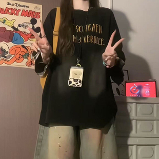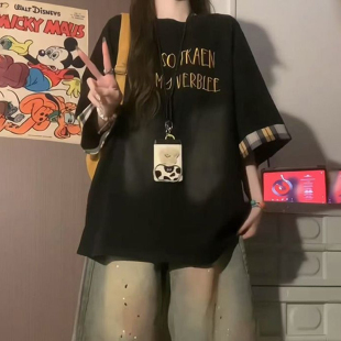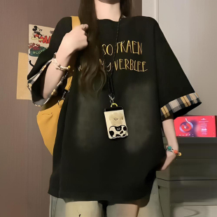 t恤女胖mm遮肚子显瘦半袖 格子拼接黑色学生短袖 上衣 美式 300斤大码