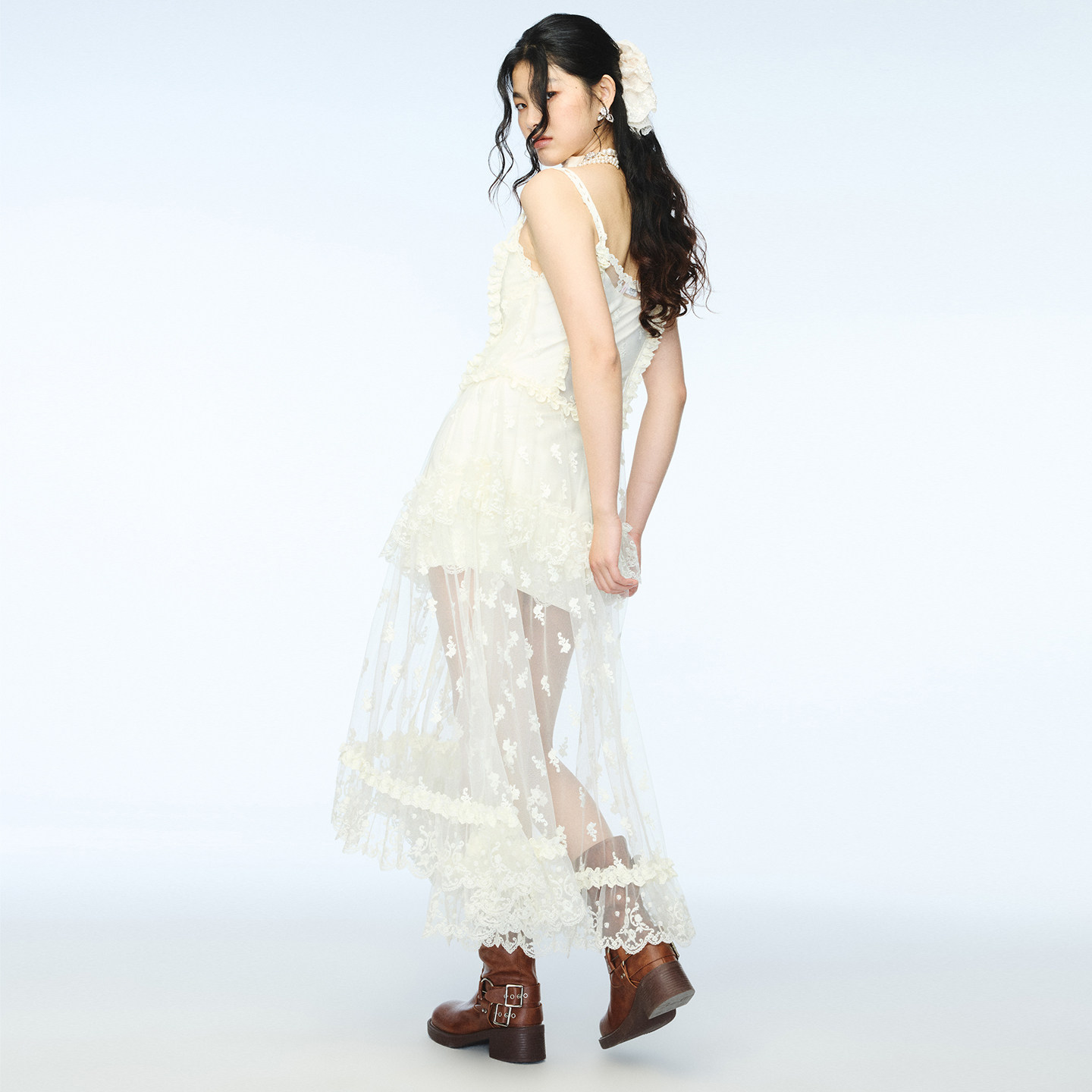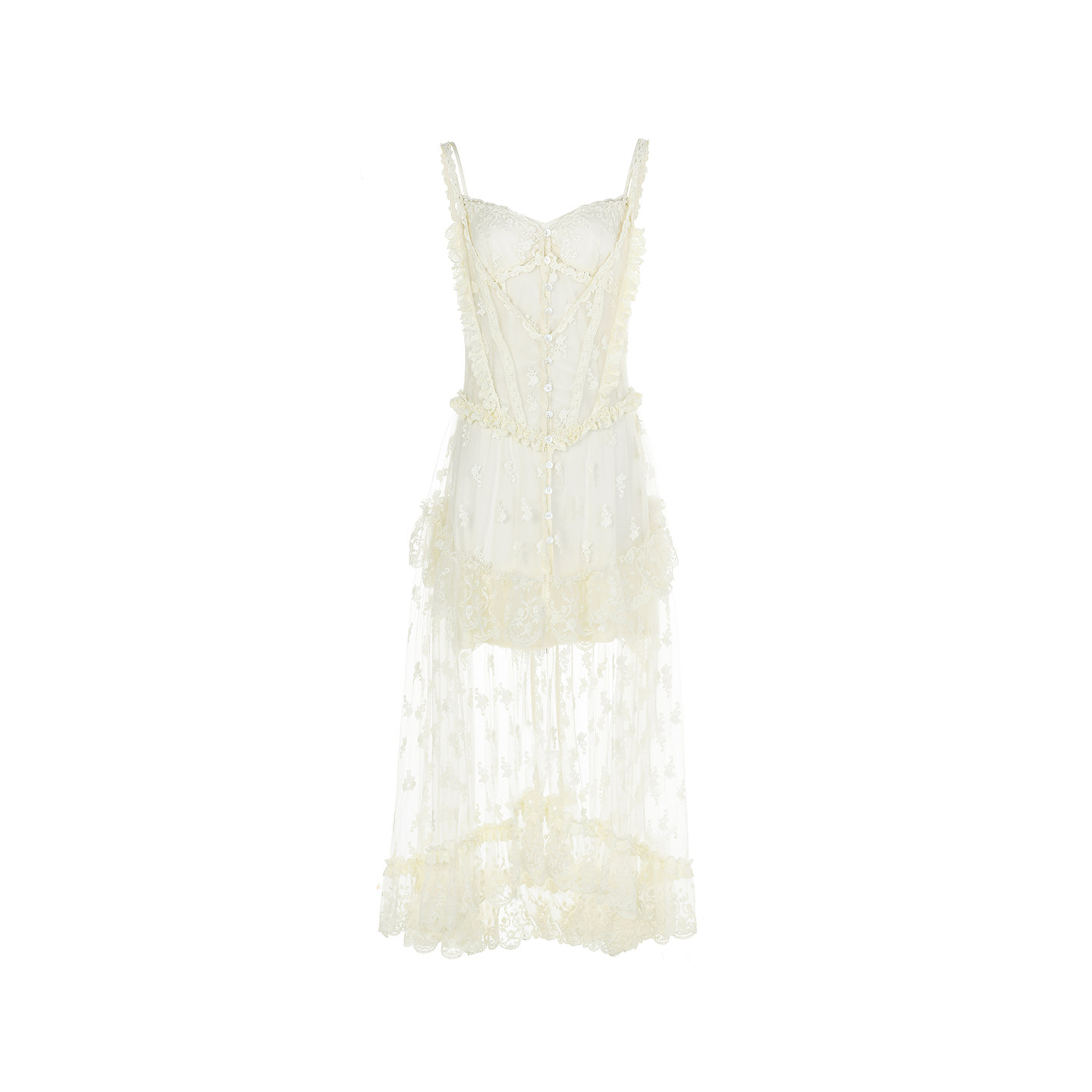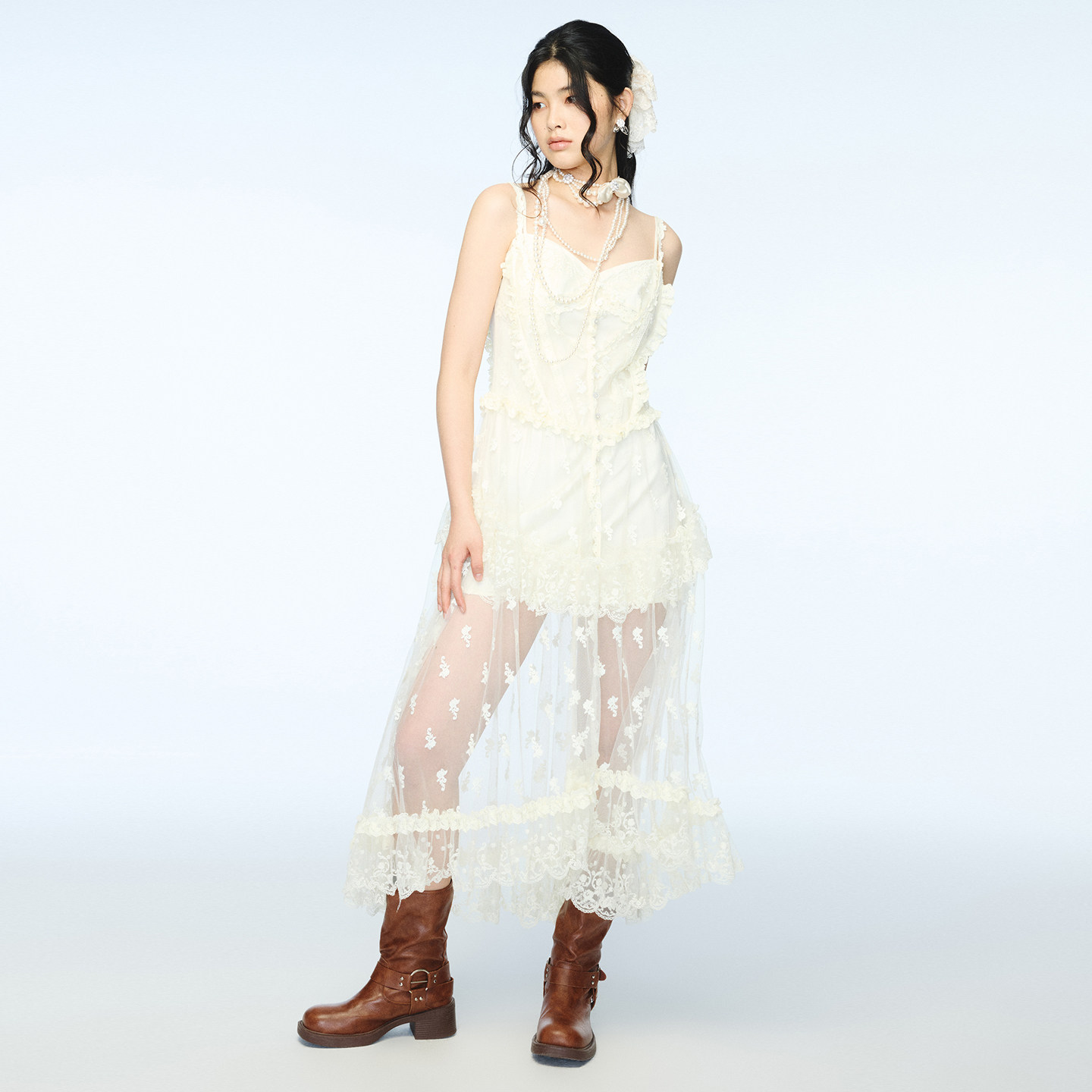 lefame拉飞姆时尚 轻薄网纱绣花蕾丝拼接连衣裙