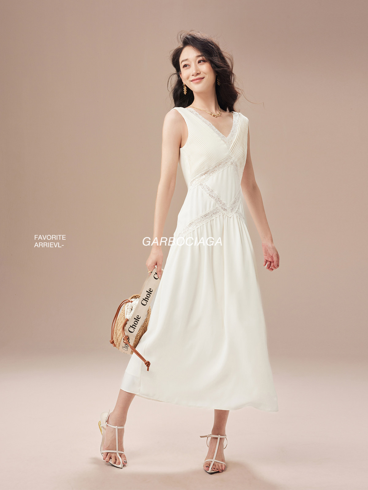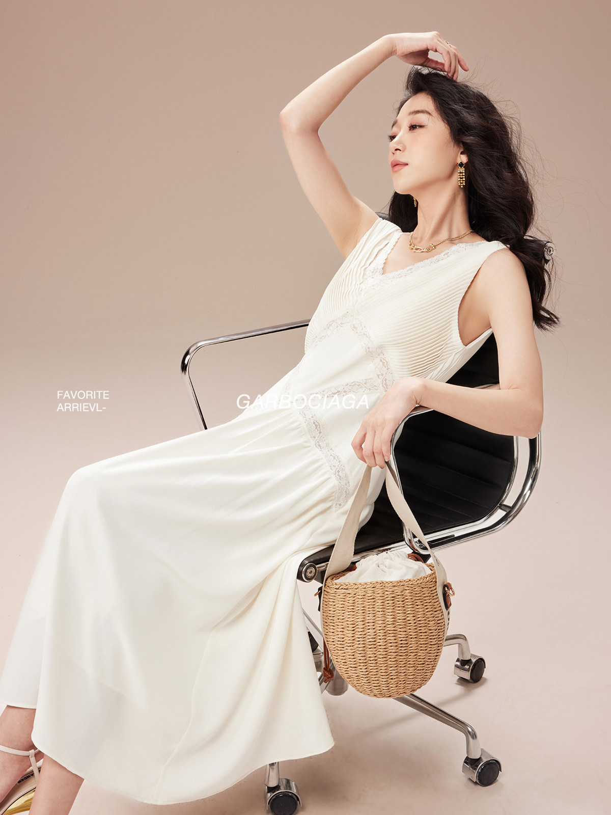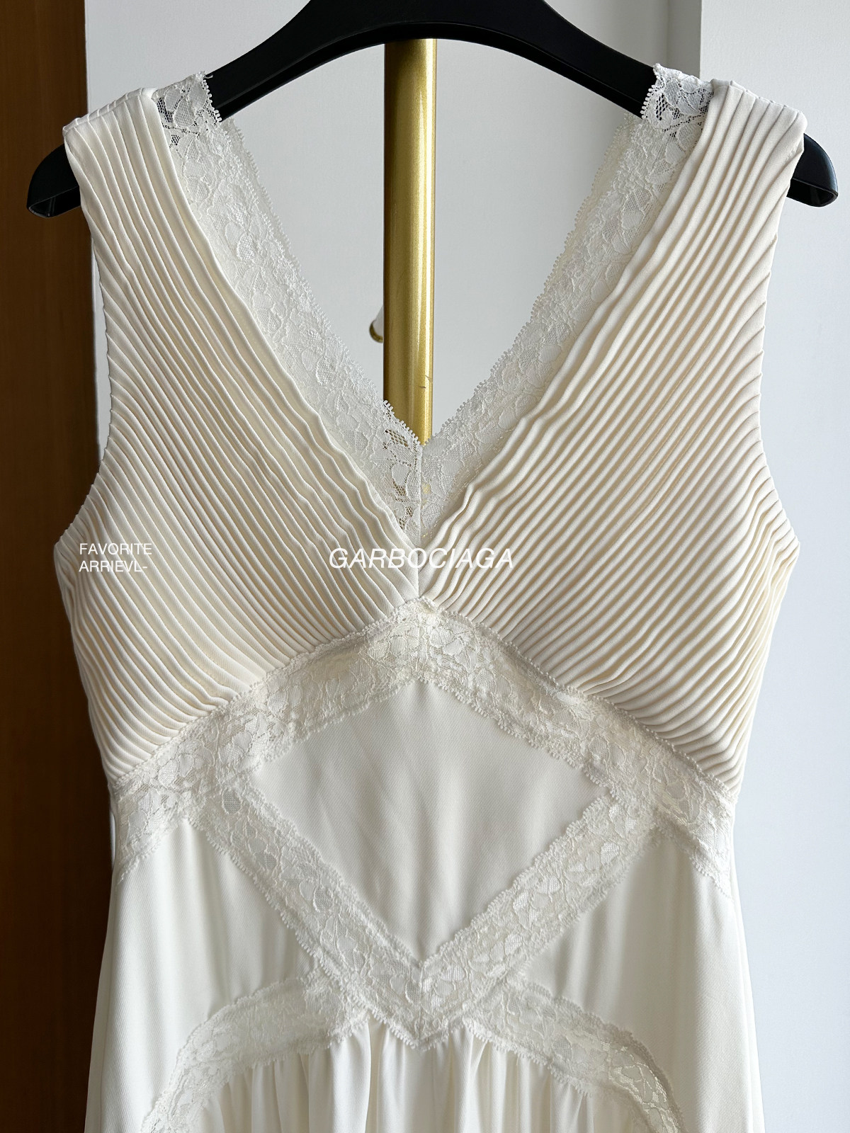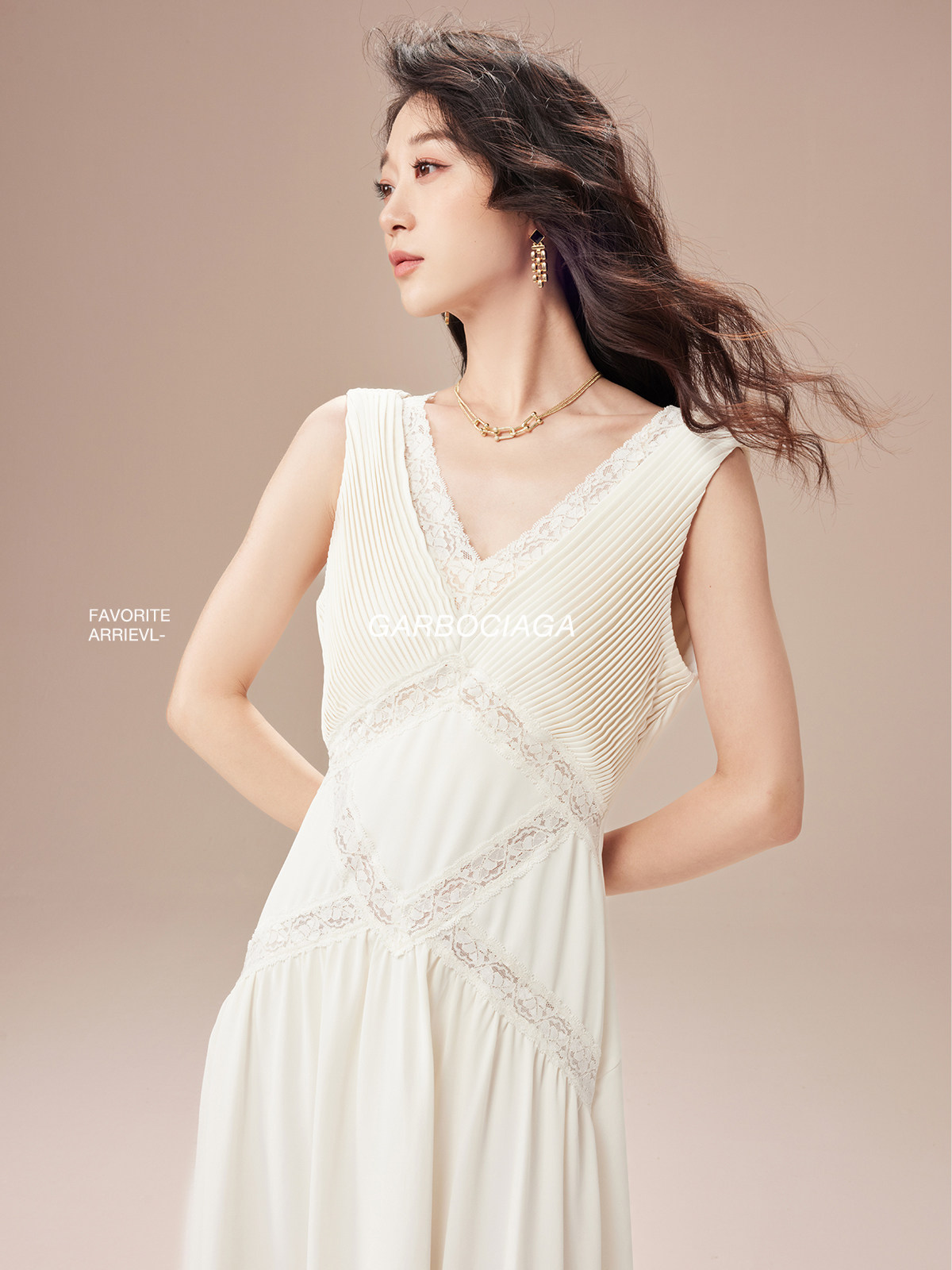 Garbociaga龍喜儿 打揽压皱蕾丝边米色高雅气质连衣裙5323 self