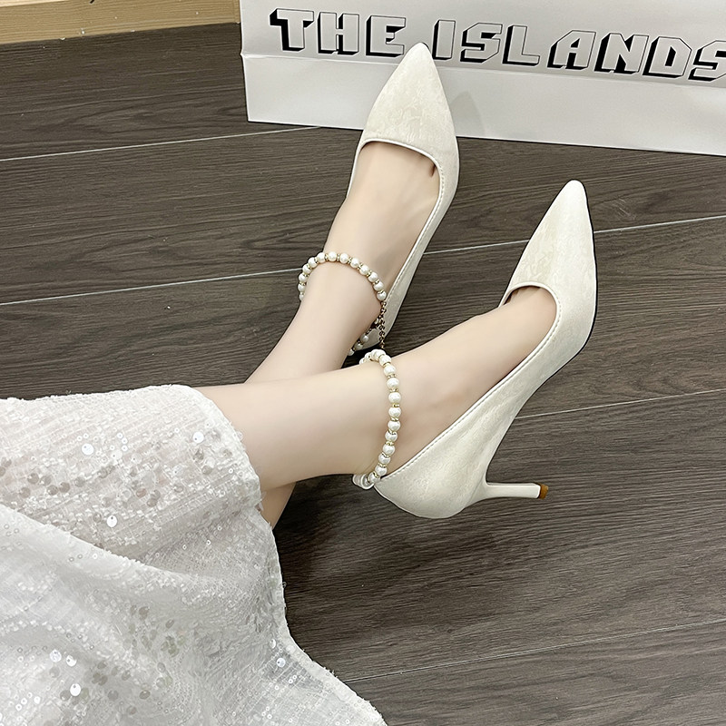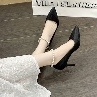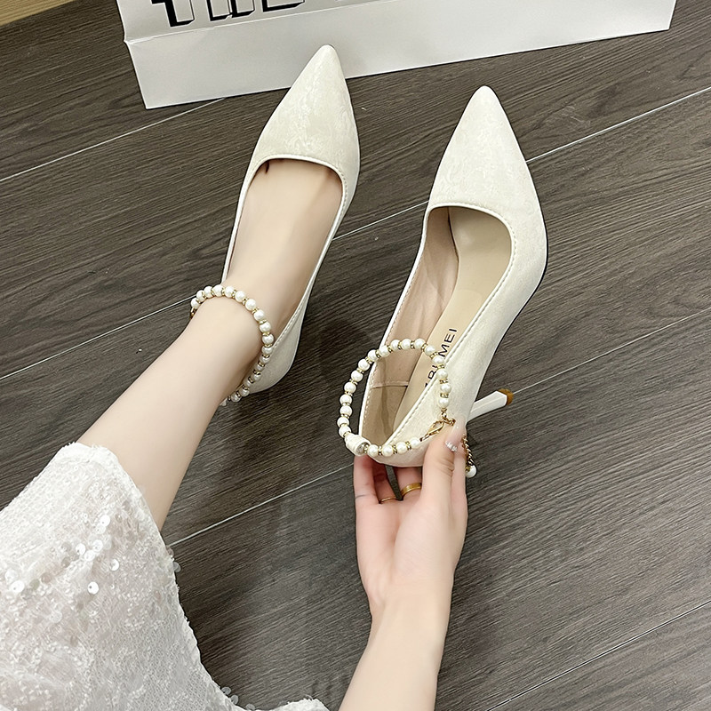 鞋 优雅珍珠配旗袍高跟鞋 子细跟皮面古风单鞋 法式 女 伴娘鞋 新中式