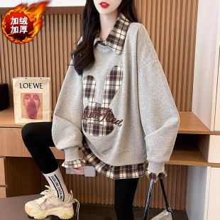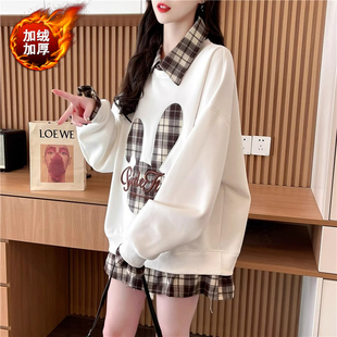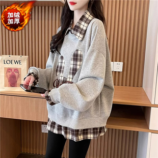 大码 格子拼接假两件加绒卫衣女秋冬季 宽松薄款 韩版 设计感上衣 新款
