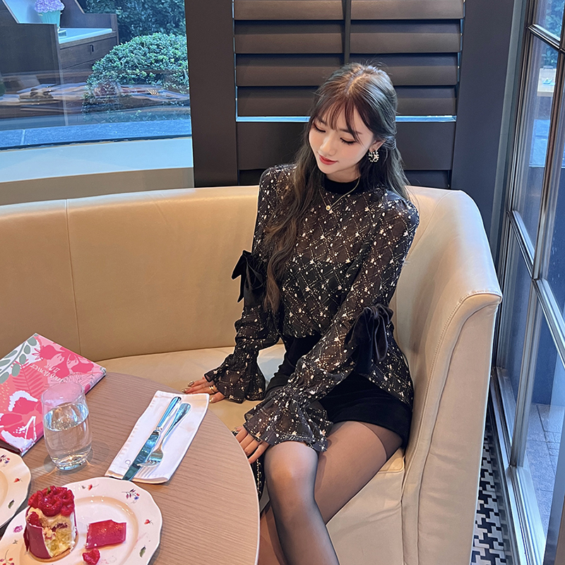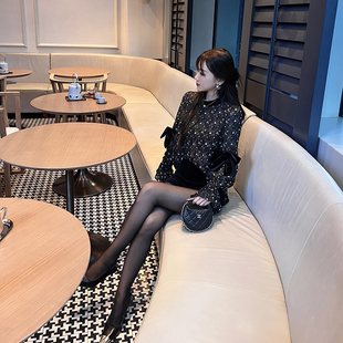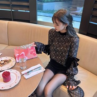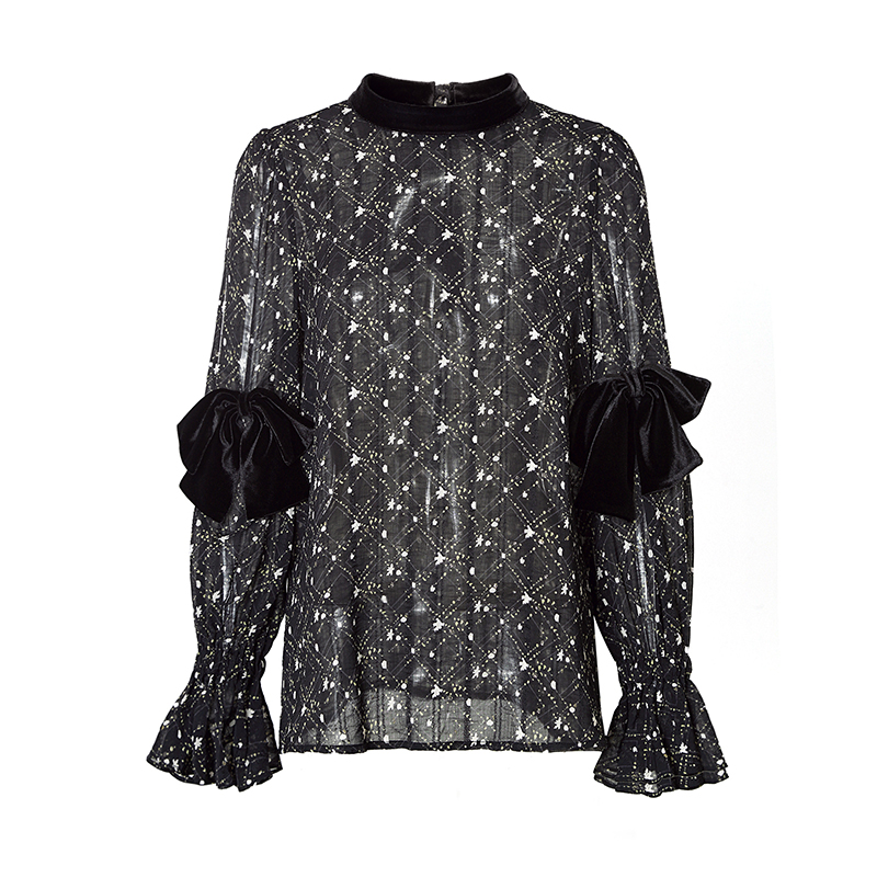 圆领雪纺衫 宁芙心心 黑丝绒蝴蝶结长袖 性感俏皮 上衣 原创设计