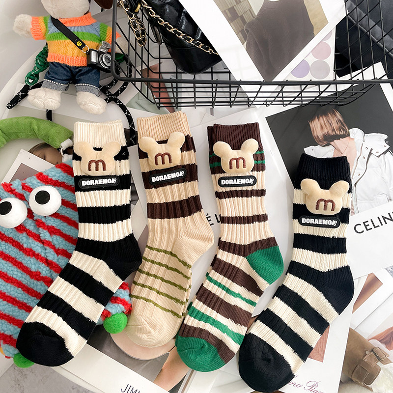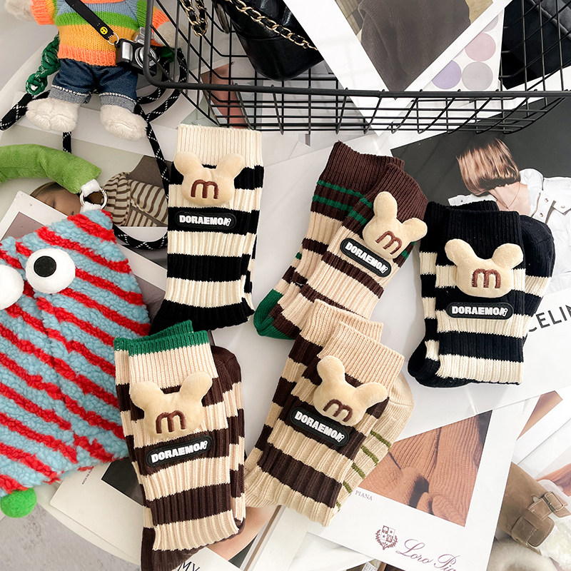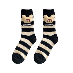 个性 长筒袜 外穿粗线条纹可爱M奇头布标中筒堆堆袜搭雪地靴鲨鱼裤