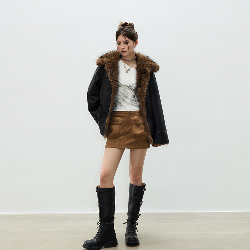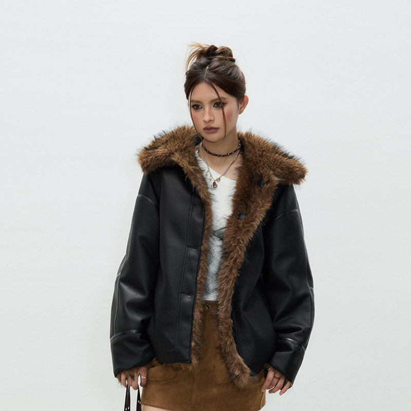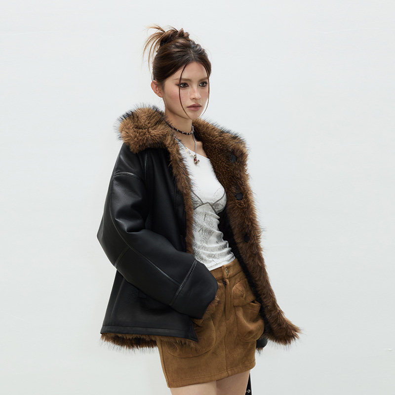 宽松百搭辣妹衣服 复古黑色毛毛外套上衣女2025新款 Vone SheeE美式