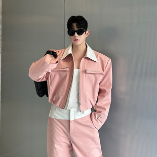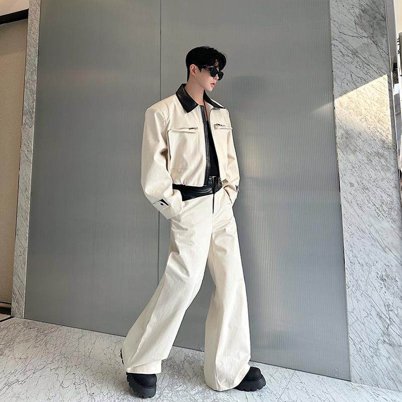 短款 撞色拼皮拉链时尚 西装 套装 两件套 2025春装 男阔腿长裤 设计师款