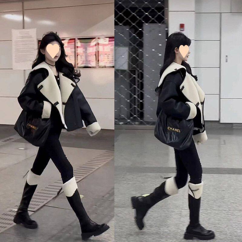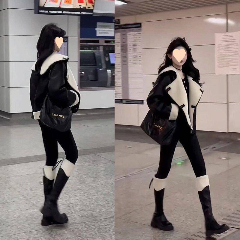 酷飒帅气年秋冬新款 外套女翻领拼接撞色纽扣宽松显瘦遮肉上衣