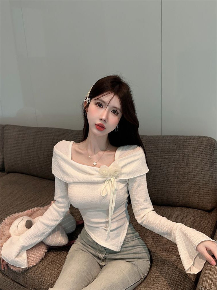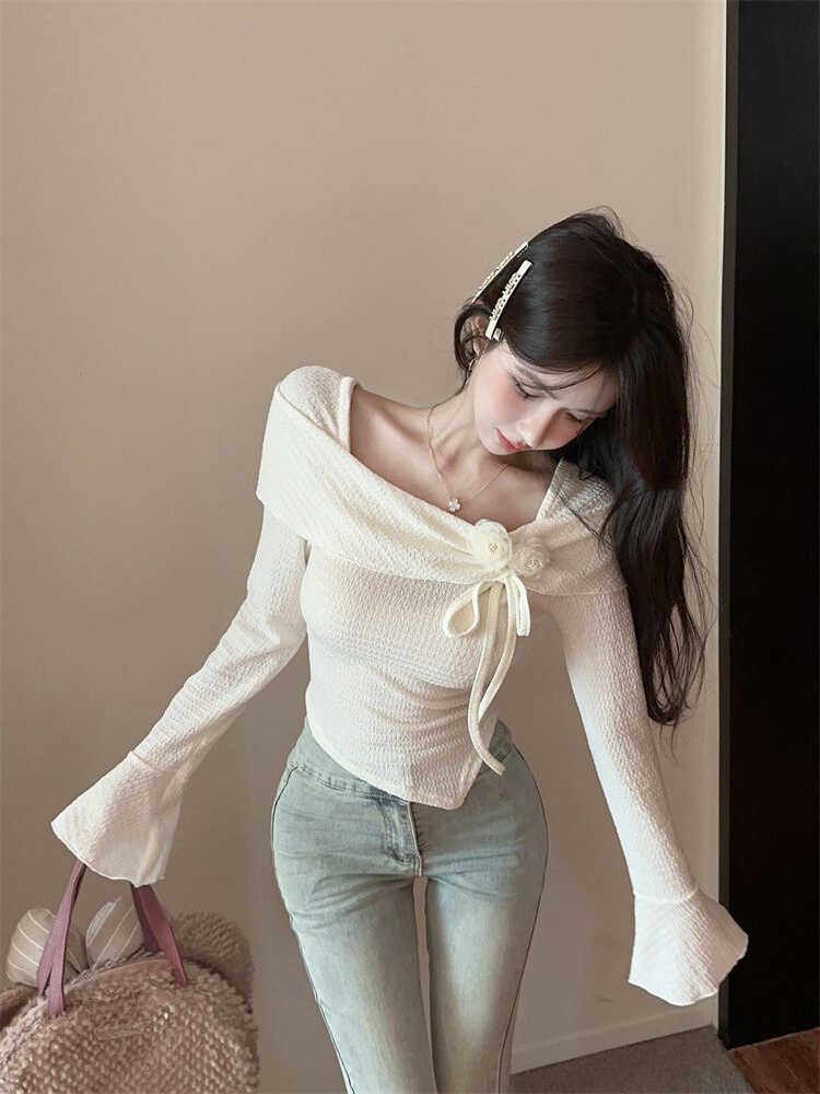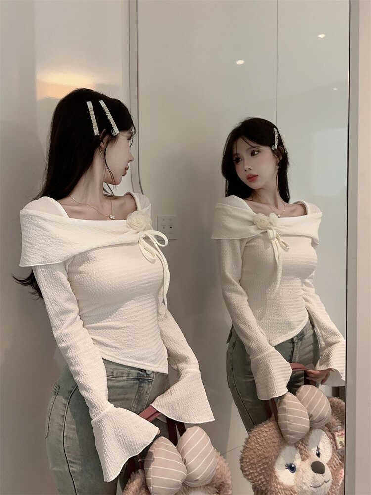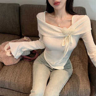 小众甜辣妹性感露肩T恤花朵抽绳系带喇叭袖 女装 上衣 新款 2026春季