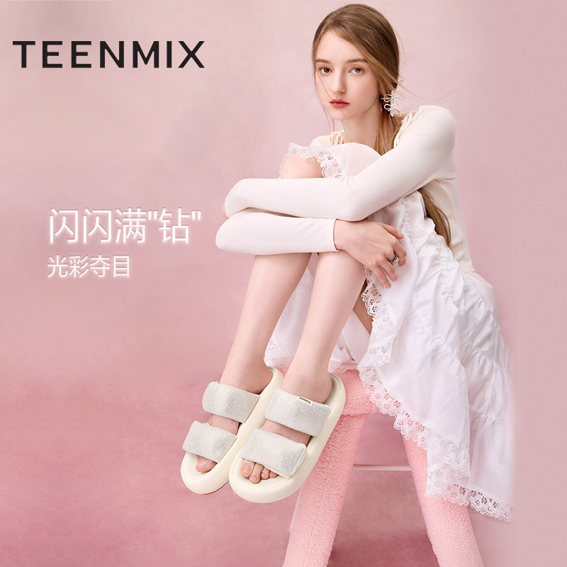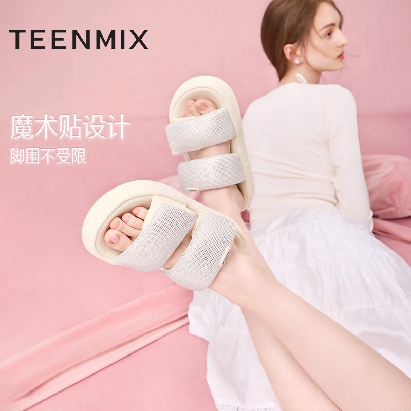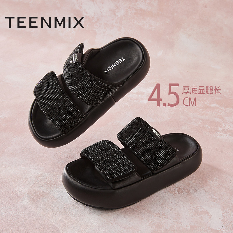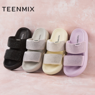新款 天美意嘭嘭凉拖闪钻一字拖厚底拖鞋 女外穿凉拖休闲凉鞋