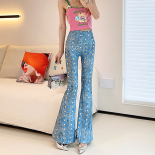 子加绒加厚款 喇叭裤 洋气百搭裤 仿牛仔印花时尚 保暖 女高腰显瘦修身