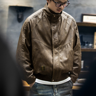 春秋防风机车外套 立领夹克上衣男士 美式 复古PU皮衣男宽松潮牌大码