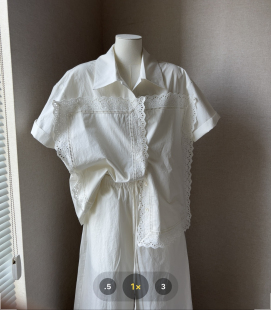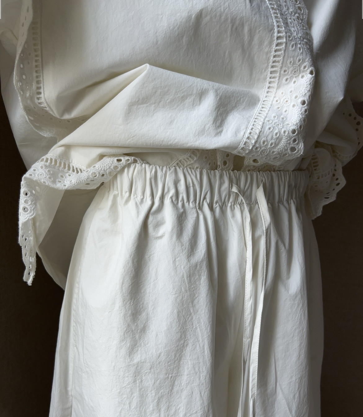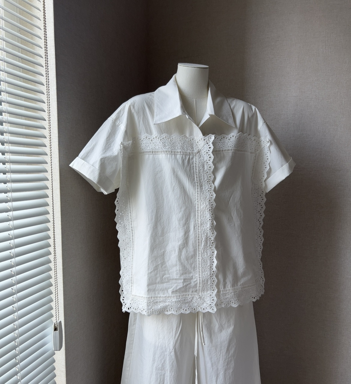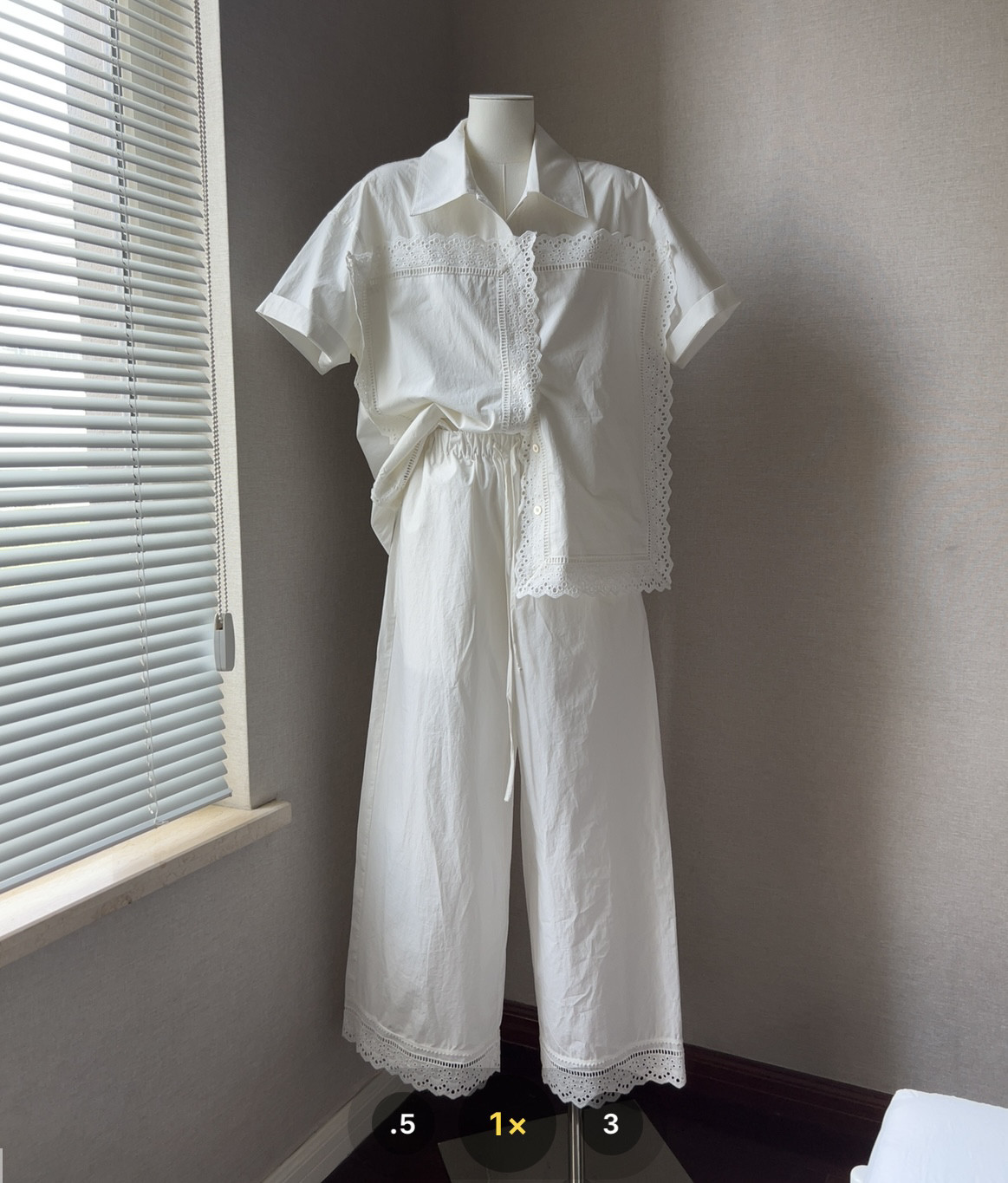 套装 all 休闲裤 长绒棉落肩上衣+宽松直筒花边蕾丝衬衫 white