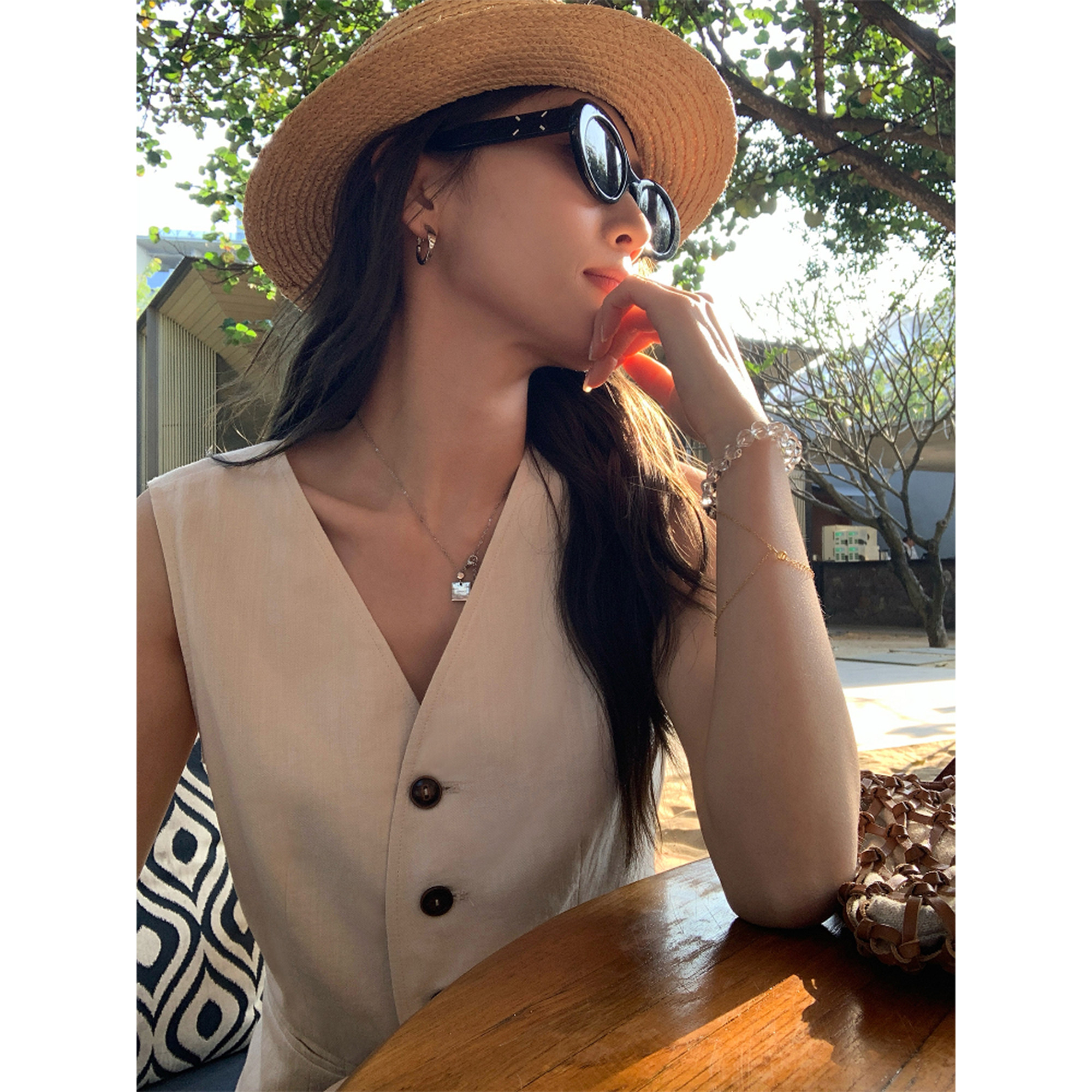 pusumede棉麻v领马甲背心女收腰设计感短款 复古洋气马夹气质上衣