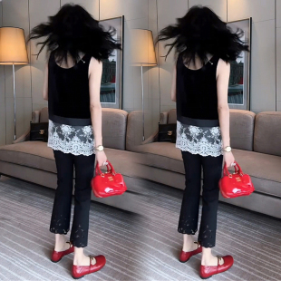 上衣 设计感小众显瘦无袖 欧货蕾丝拼接丝绒吊带背心女2025春季 法式