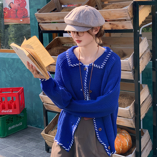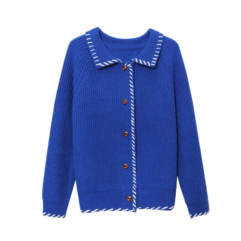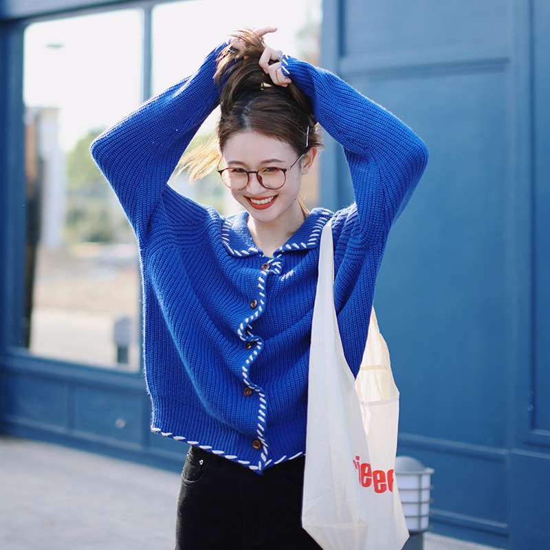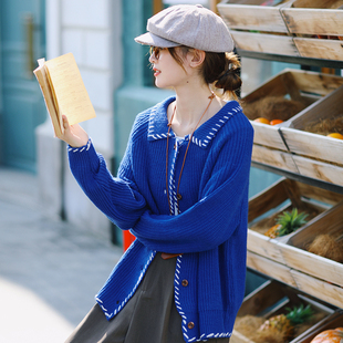 毛衣 秋宽松针织衫 花吉B842宝蓝色手缝线翻领针织开衫 女2025年新款