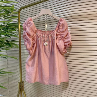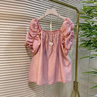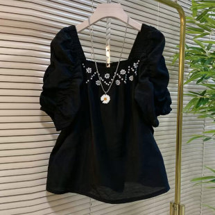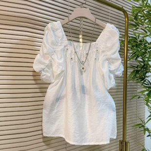 大码 方领钉珠花朵短袖 女装 款 上衣 夏季 胖妹妹小众设计洋气减龄韩版