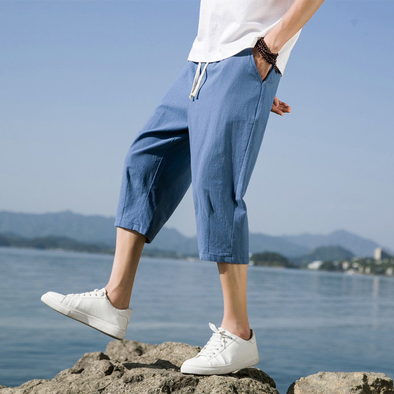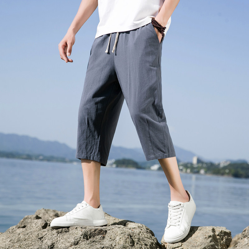 男士 纯棉短裤 六分裤 休闲亚麻中裤 子外穿 夏季 宽松运动沙滩裤 超薄款