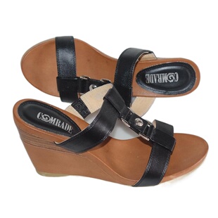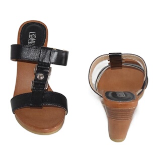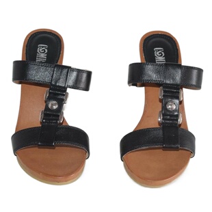 拍图用1431009 真皮女凉鞋 黑色牛皮坡跟女拖鞋 牛筋底高跟真皮夏季