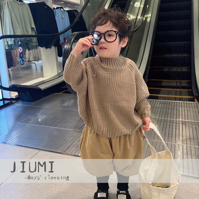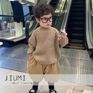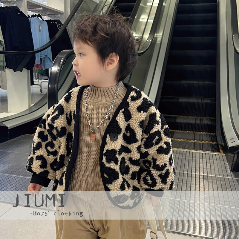男童加厚半高领毛衣 加绒长裤 男宝宝秋冬套装 儿童豹纹毛毛外套冬款