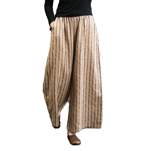 女显瘦垂感休闲直筒九分裤 文艺复古棉麻条纹阔腿裤 新款 2025年夏季