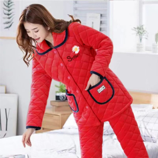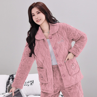 女士中年三层夹棉袄秋冬季 睡衣加厚加绒珊瑚绒保暖妈妈家居服套装