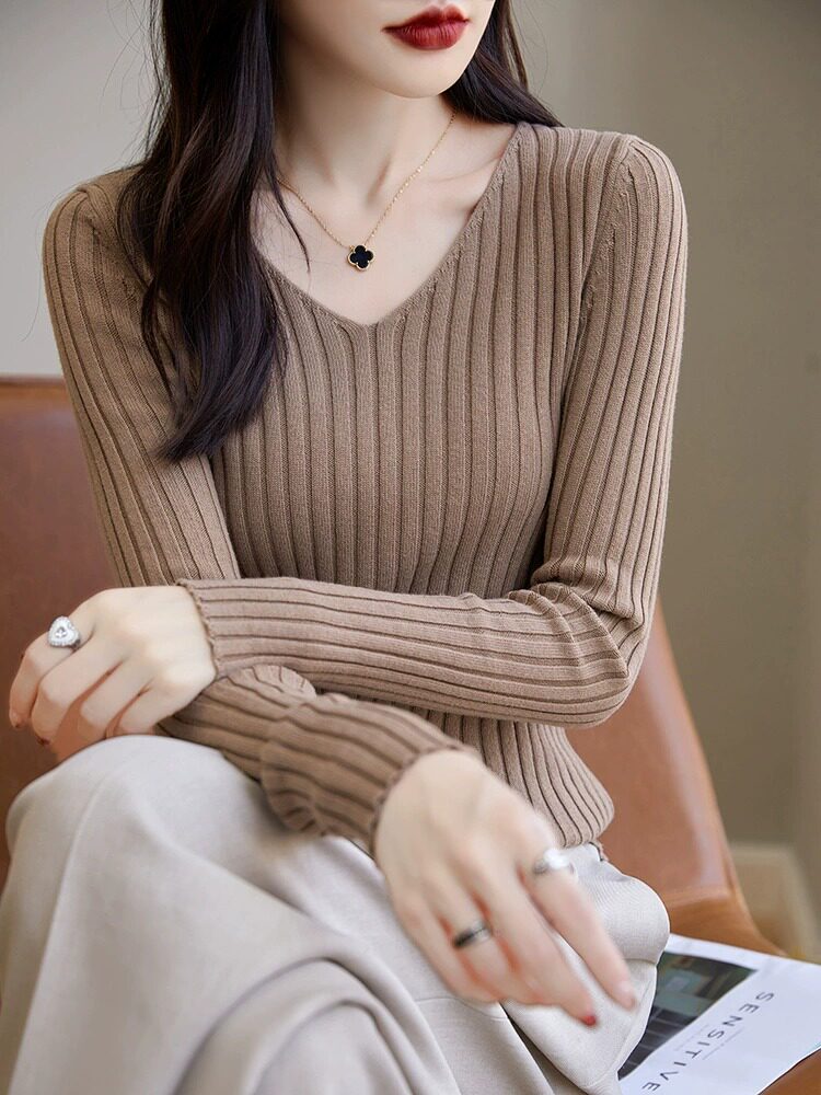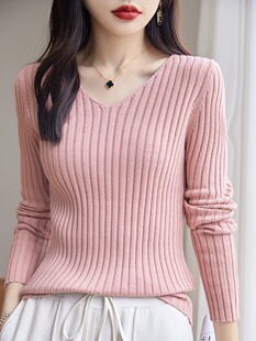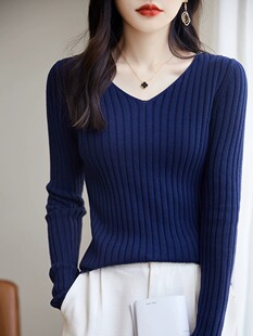 针织毛衣秋冬长袖 女内搭2025新款 打底衫 不起球100%纯棉线v领修身
