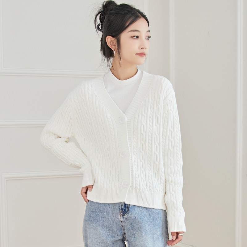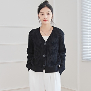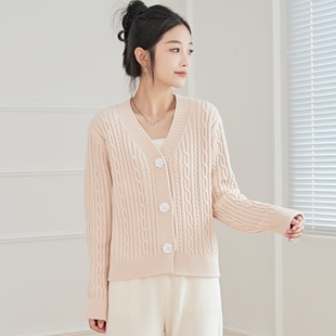 东润莲品牌纯棉毛衣女V领长袖 短外套 外穿春秋加厚全棉线针织开衫