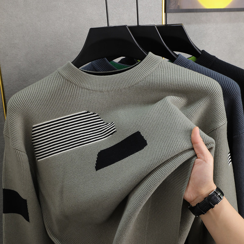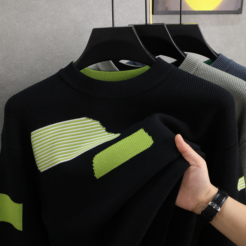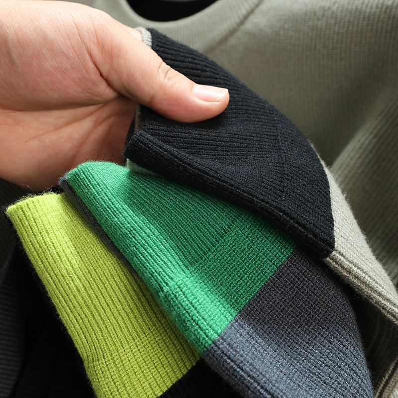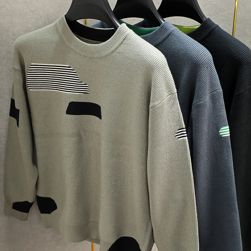 落肩袖 打底衫 宽松针织衫 长袖 男士 潮牌拼色毛衣男圆领2023秋冬款