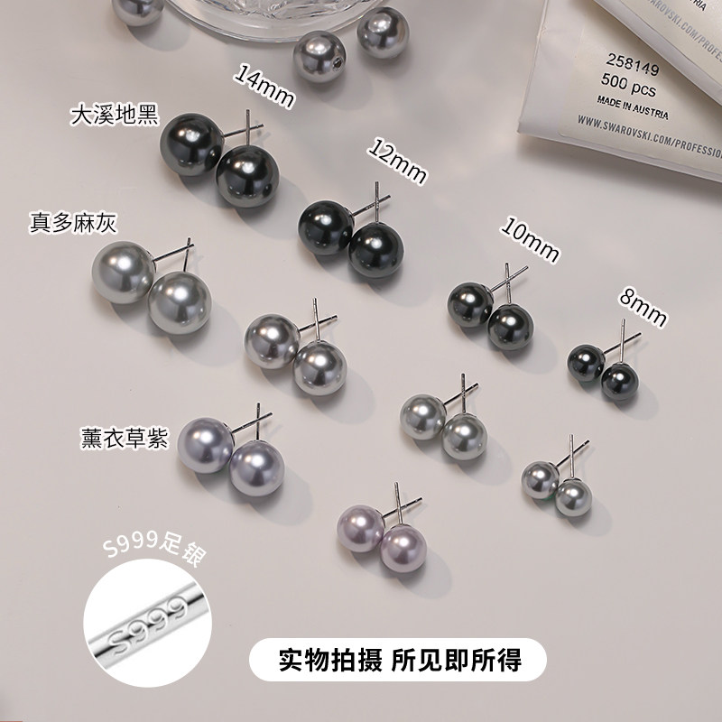 施家真多麻灰色珍珠耳钉女耳夹无耳洞女大溪地黑纯银珍珠耳饰耳环