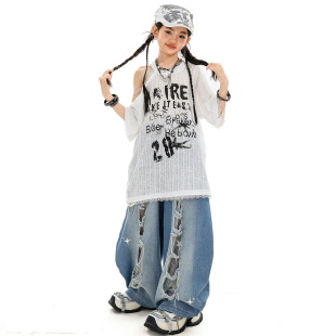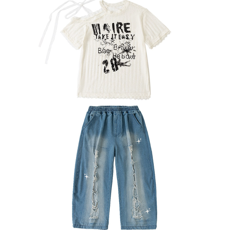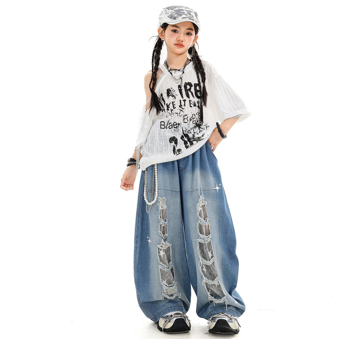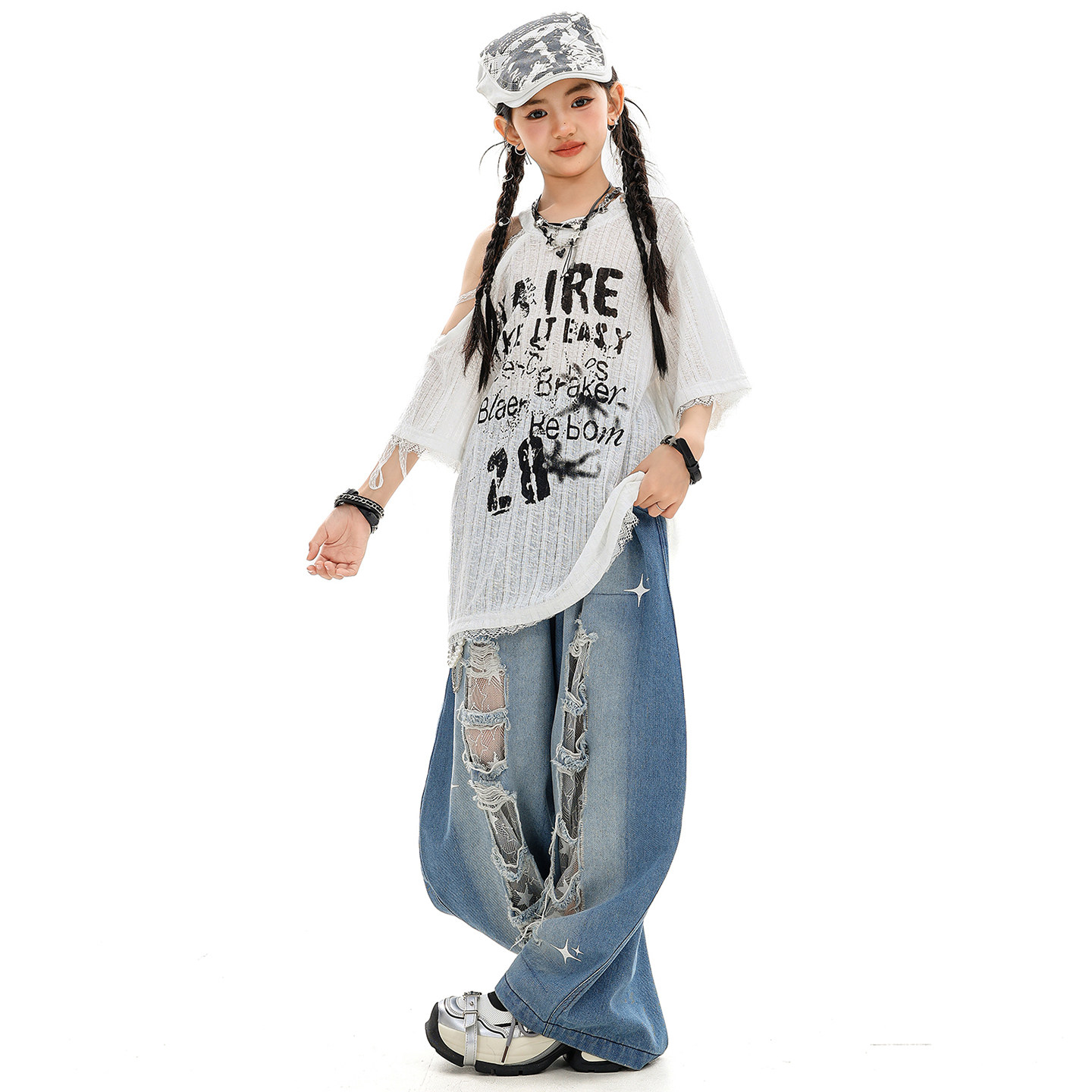 爵士舞服女童韩版 jazz舞蹈服女孩街舞现代舞表演服 露肩T恤牛仔裤