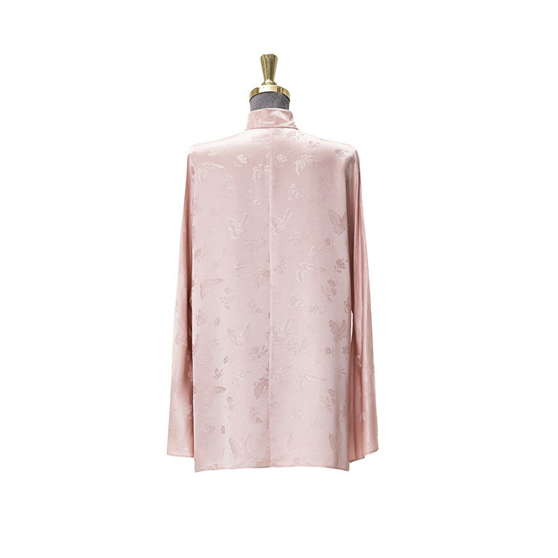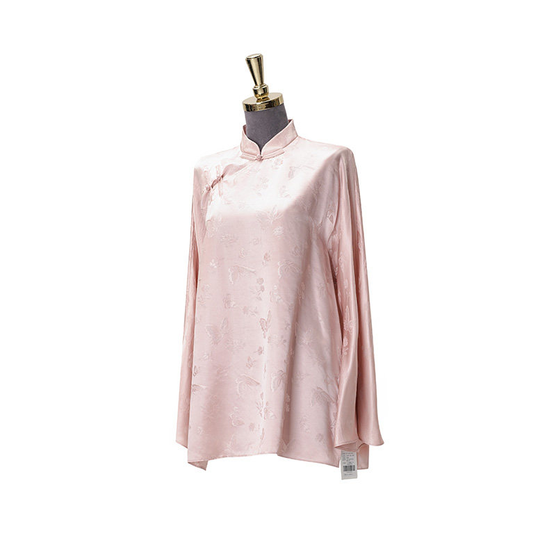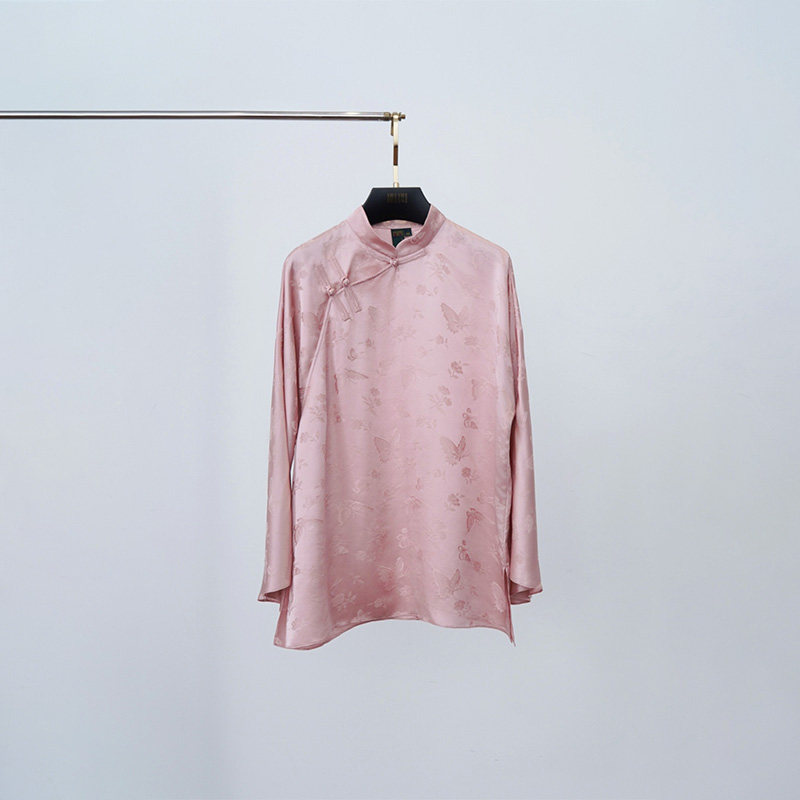 门里门外2025年新品 盘扣设计女 粉色蝶恋花真丝提花上衣立领新中式