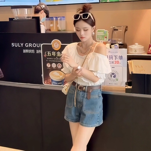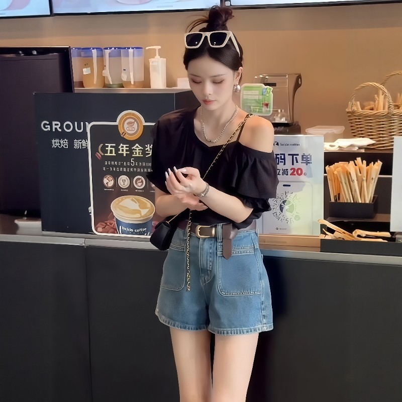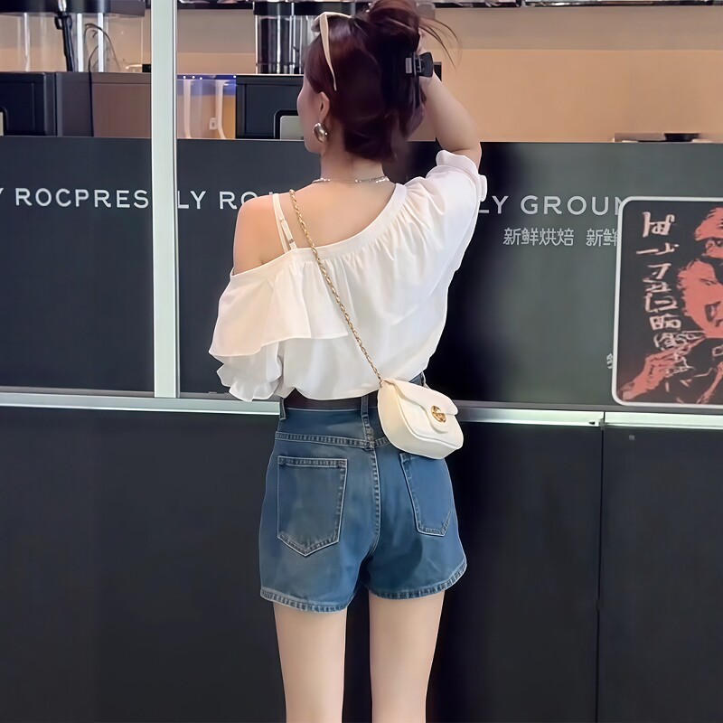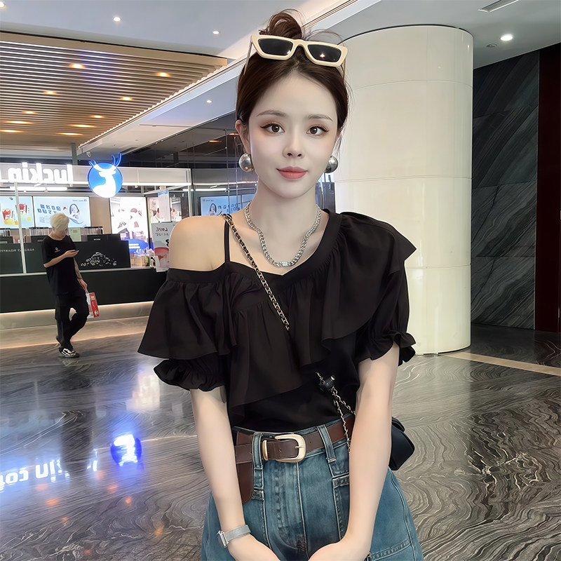荷叶边高级设计感一字肩不规则衬衫 露肩雪纺上衣 女夏洋气漂亮小衫