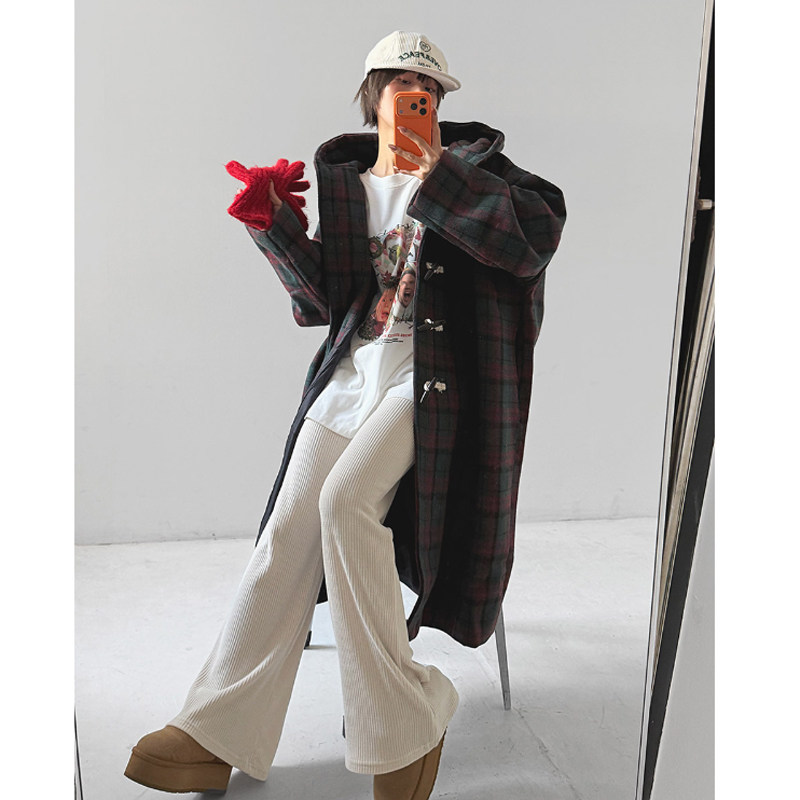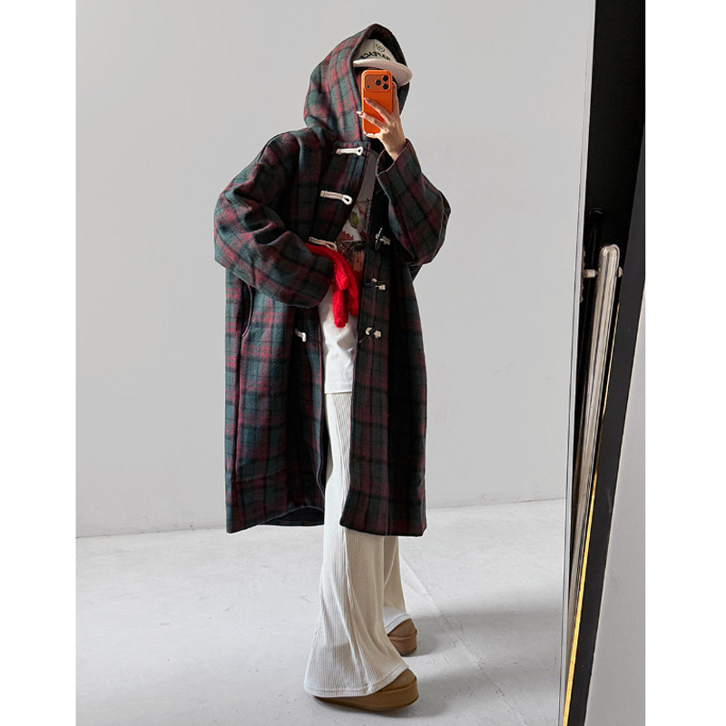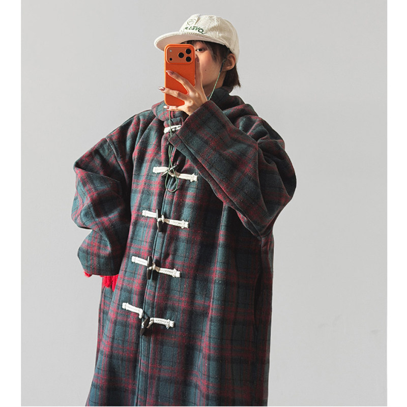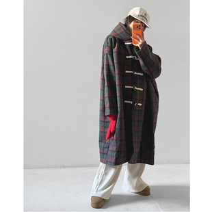 外套男女秋冬 复古牛角扣连帽毛呢大衣学院风宽松长款 马登工装 美式