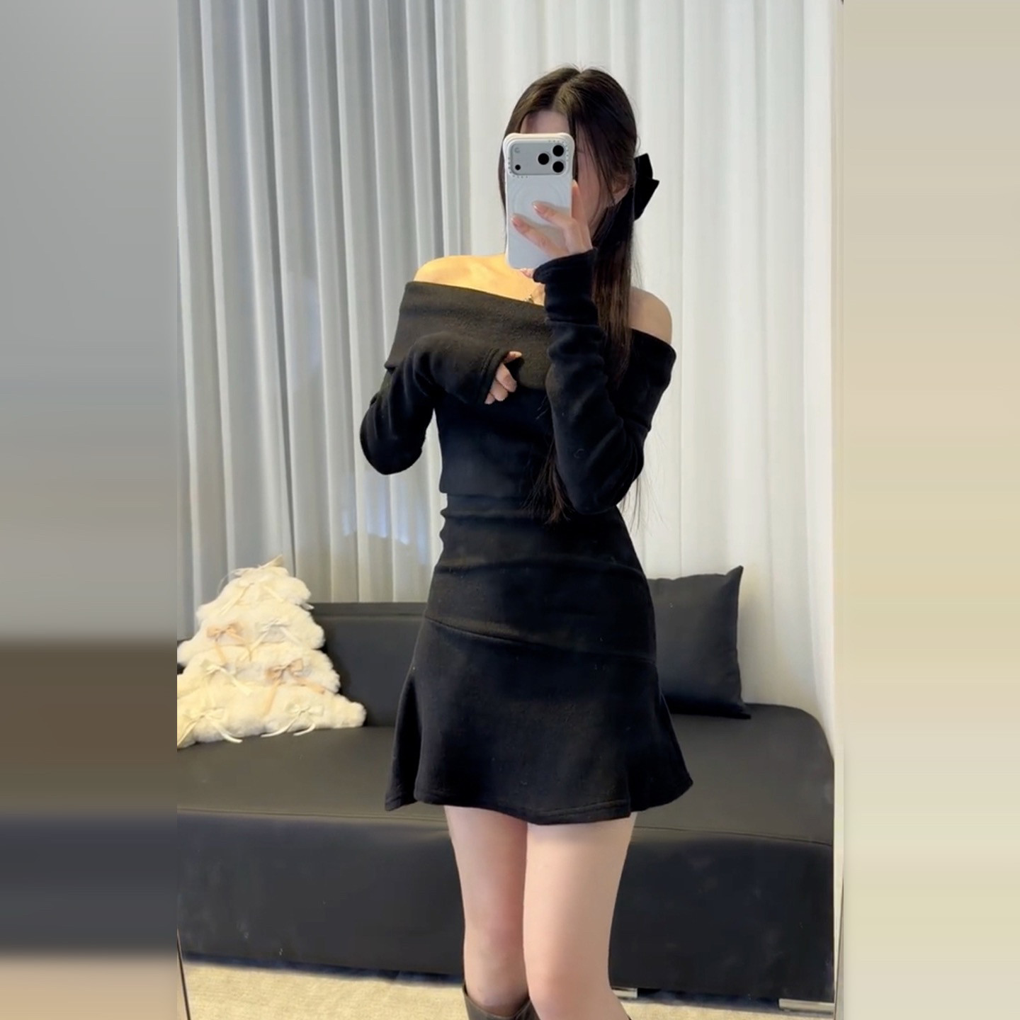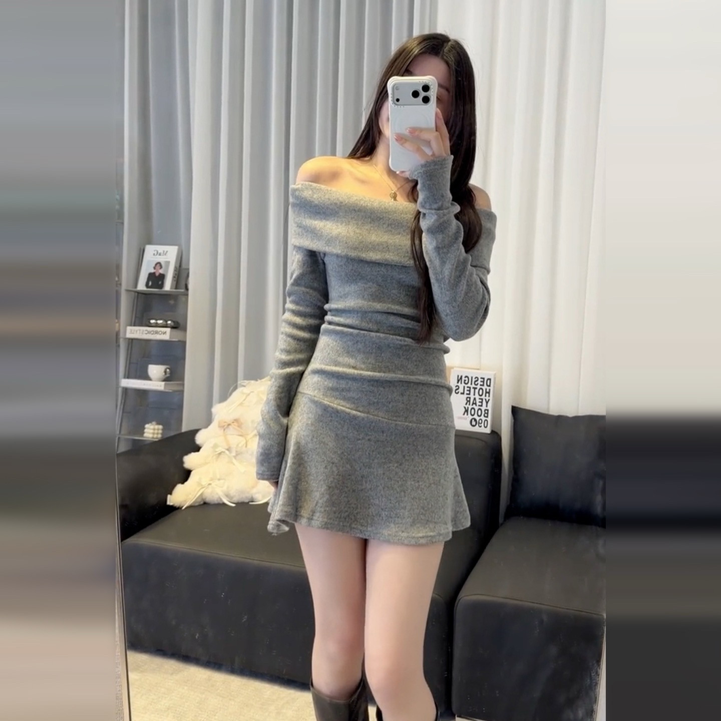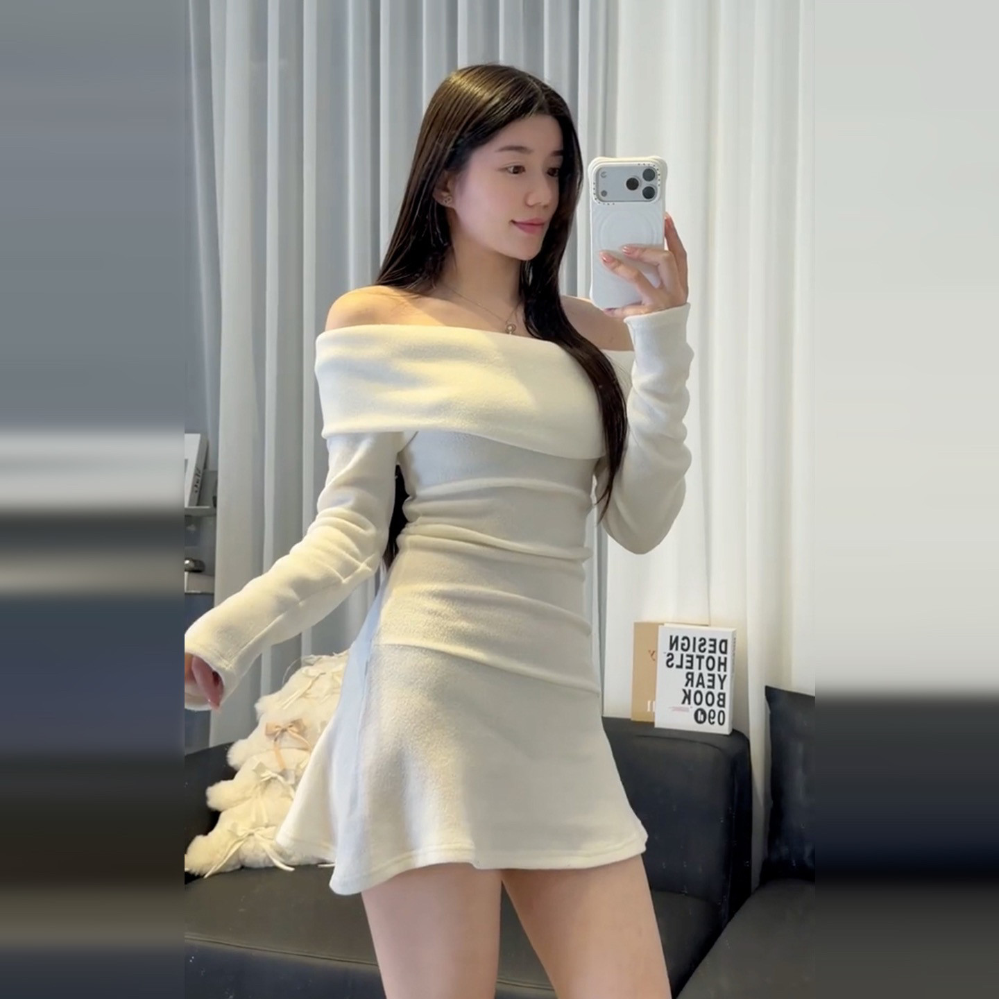 圣诞穿搭白色一字肩连衣裙子女秋冬季 巨好看内搭包臀短裙 2025新款