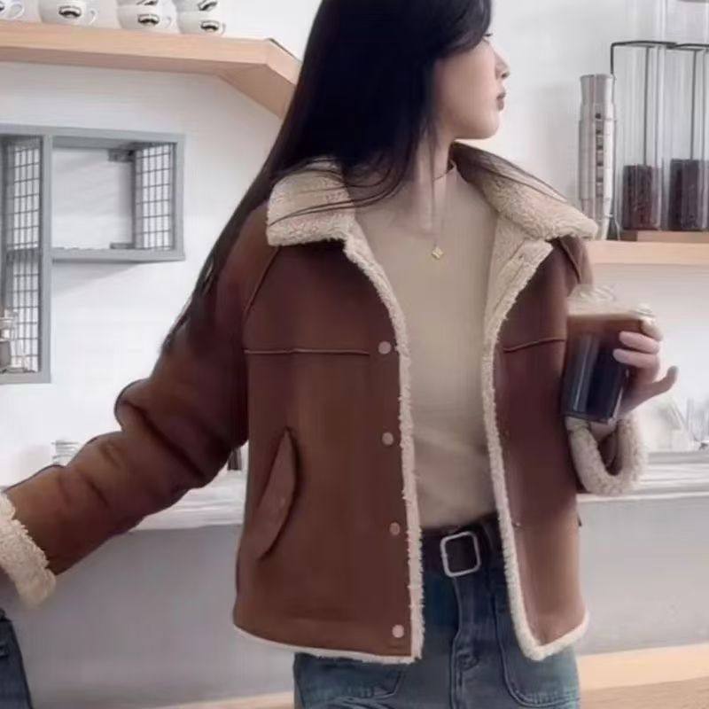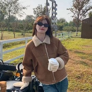 外套女秋冬款 宽松加厚保暖羊羔毛皮毛一体棉服上衣 美拉德穿搭短款
