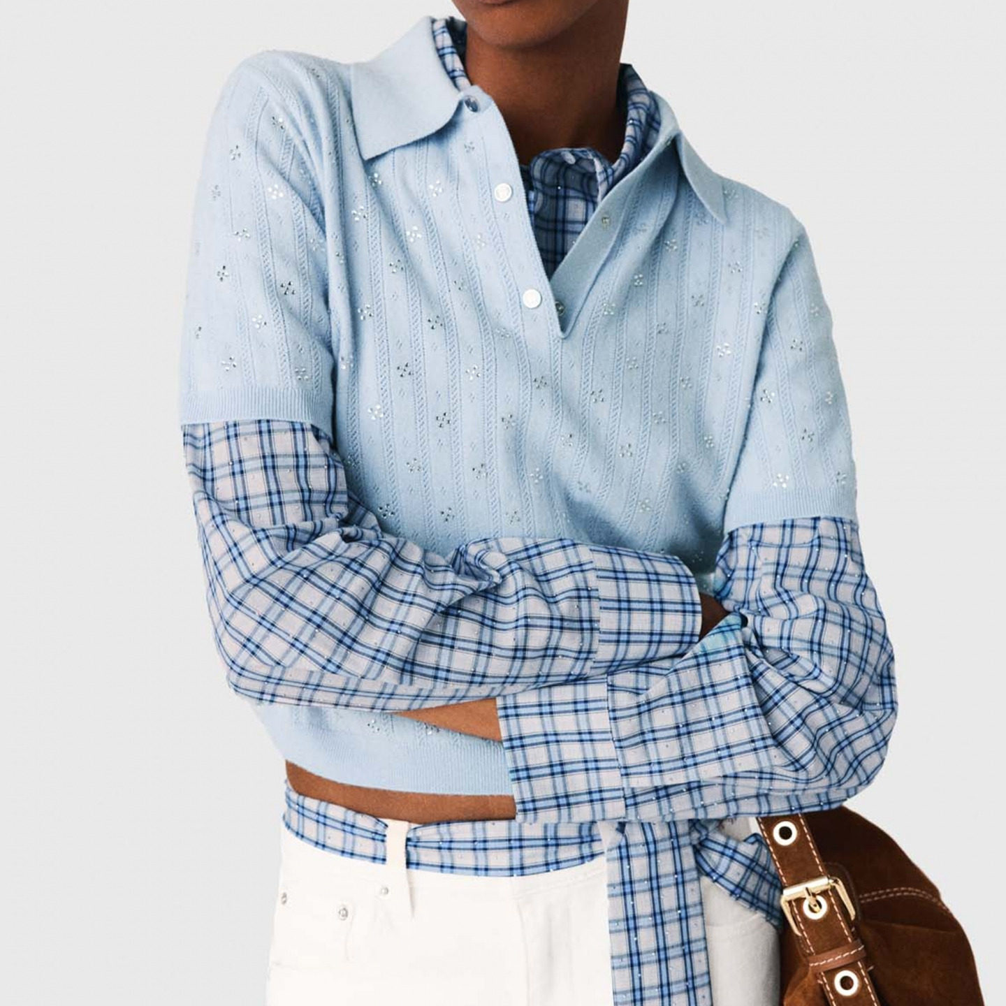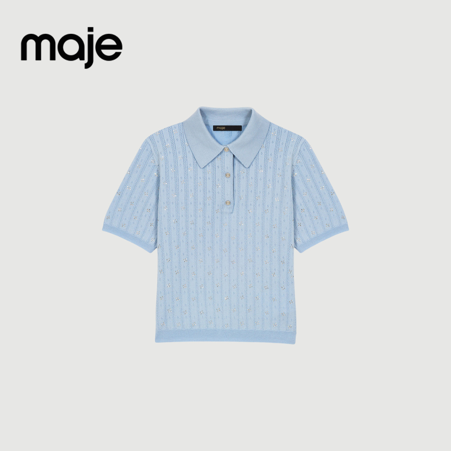 女装 饰短袖 法式 天蓝色仿钻装 翻领针织上衣 时尚 Maje2026早春新款