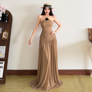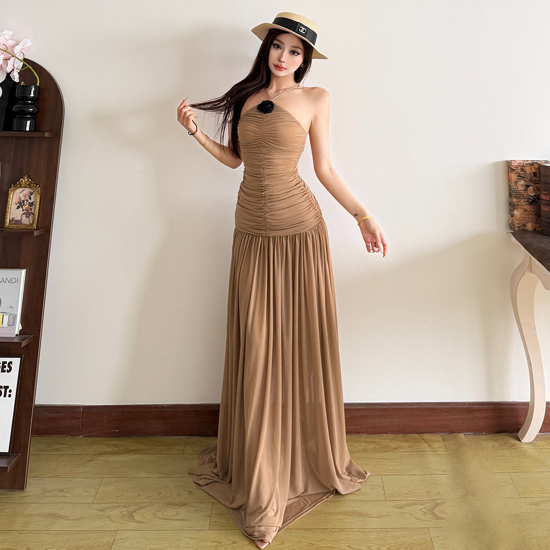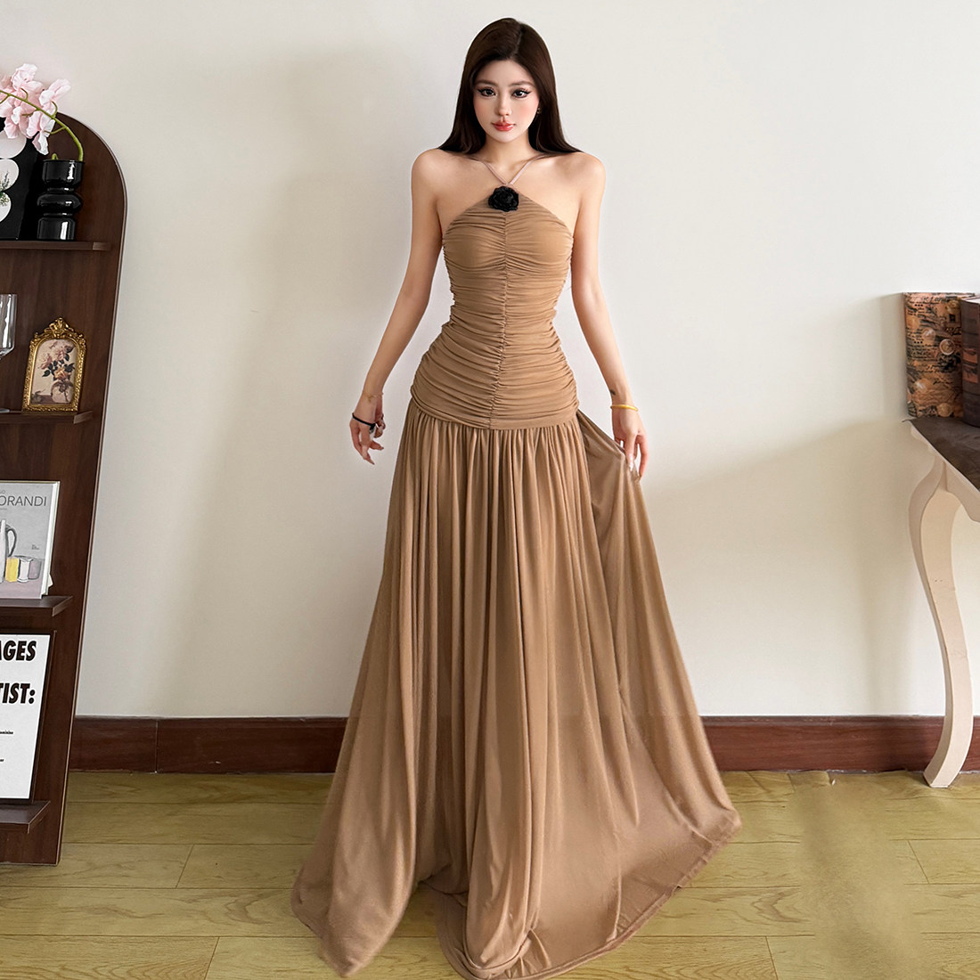SylCue 辣妹长裙 复古风撞色立体花饰褶皱显瘦挂脖连衣裙百搭修身