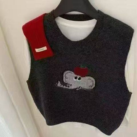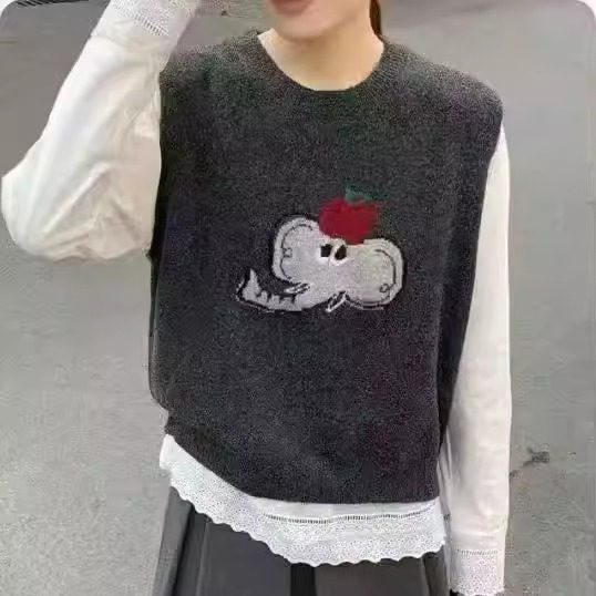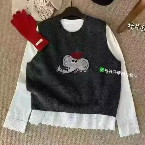 圆领无袖 叠穿套装 毛衣 可爱风小象提花针织马甲两件套女冬季 韩版
