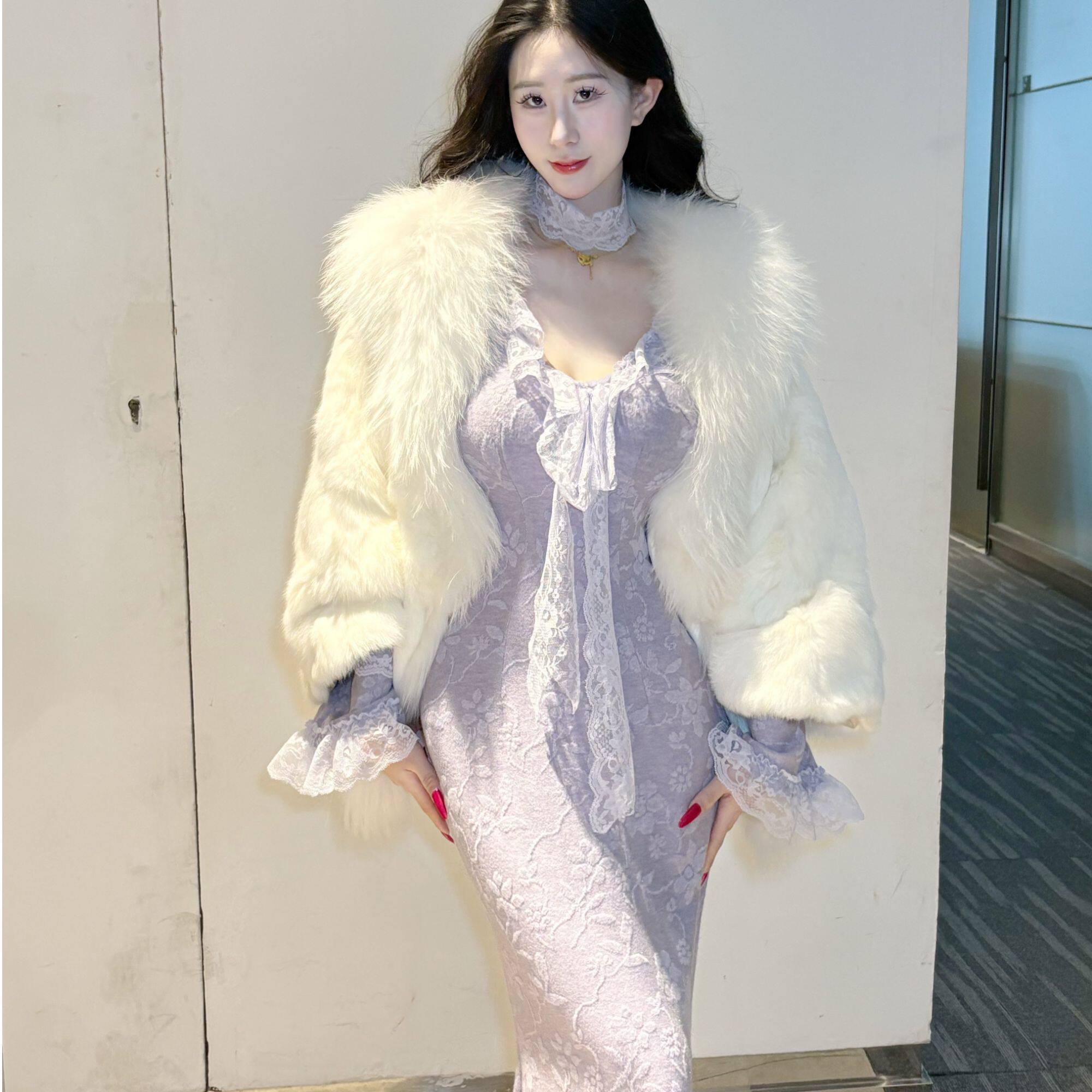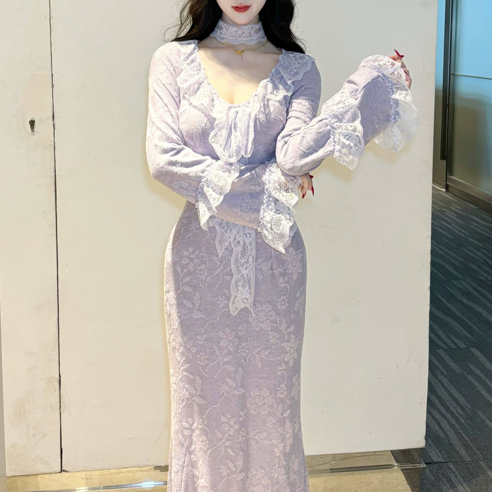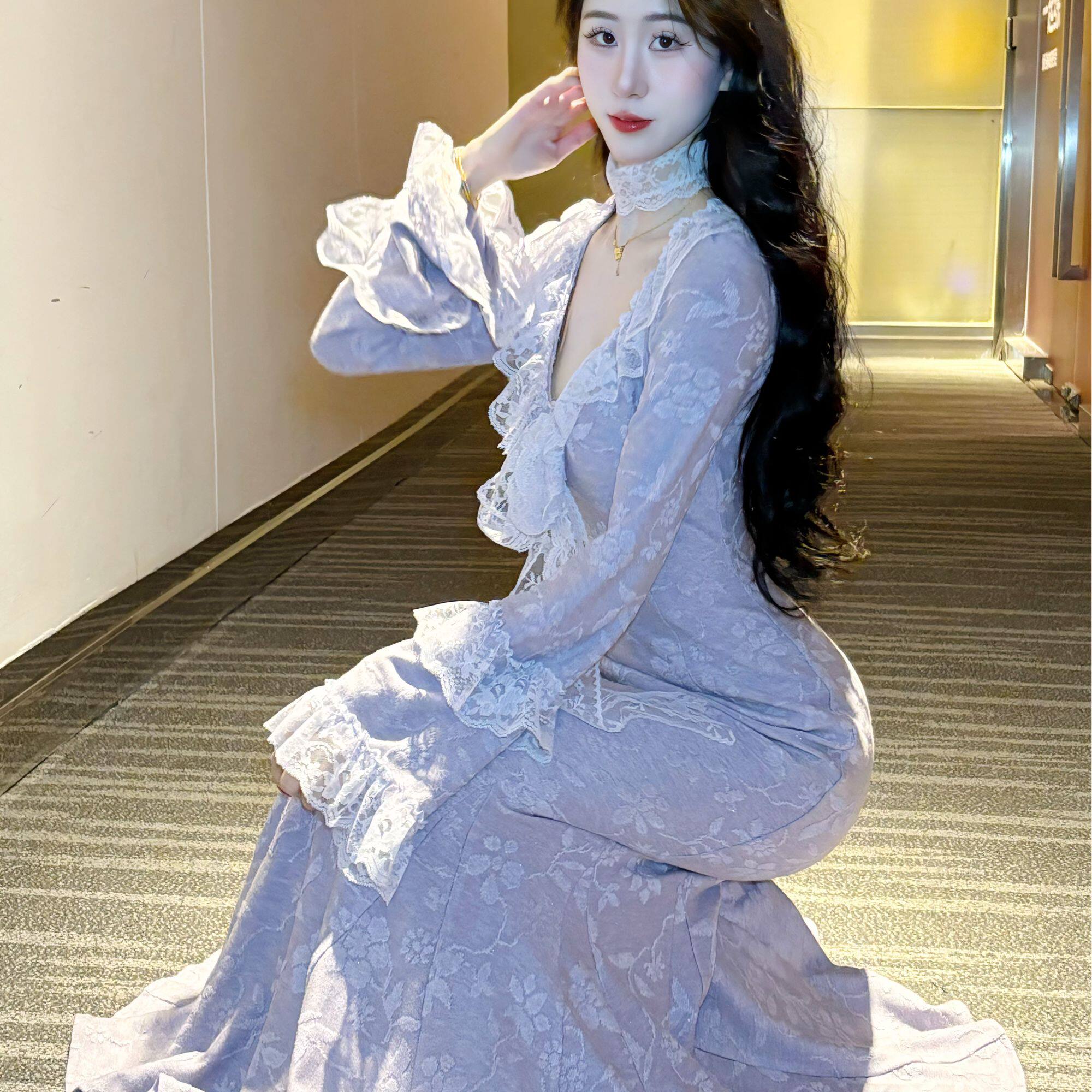 画报夫人原创自制针织蕾丝温柔复古淡紫色仙女裙步步生莲