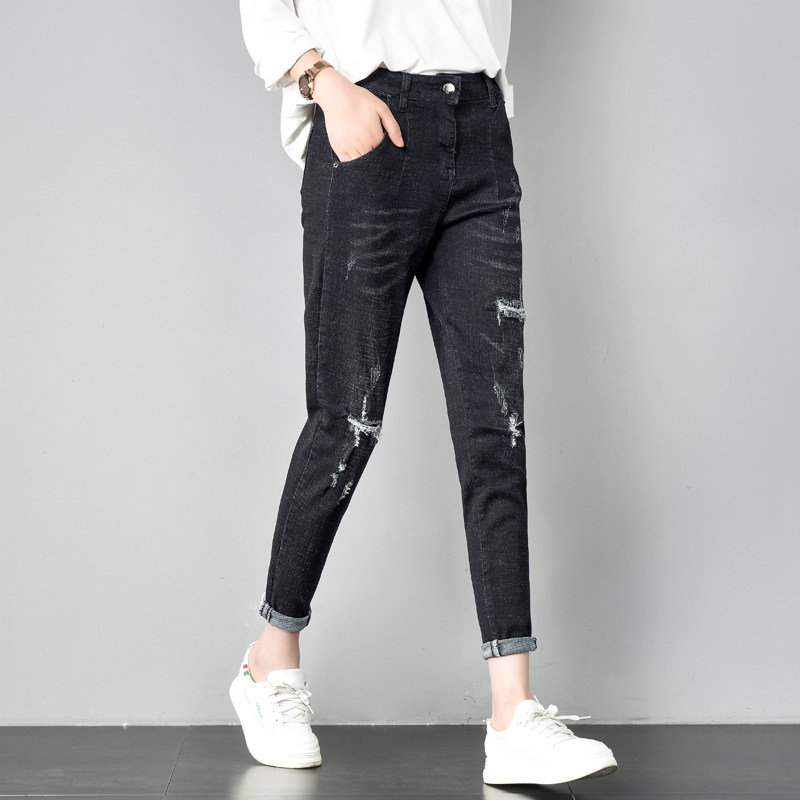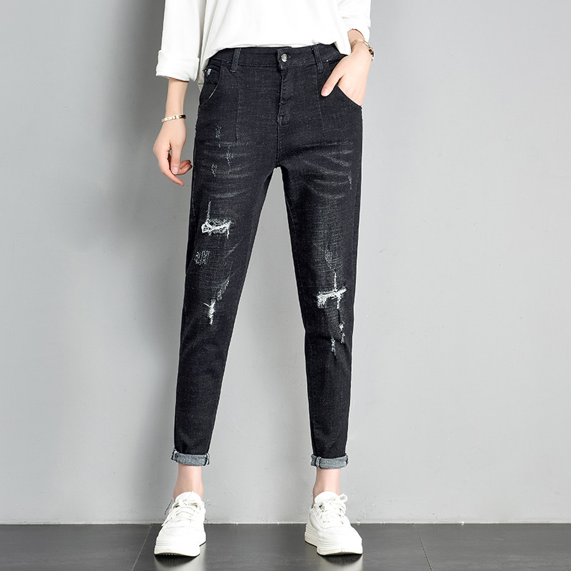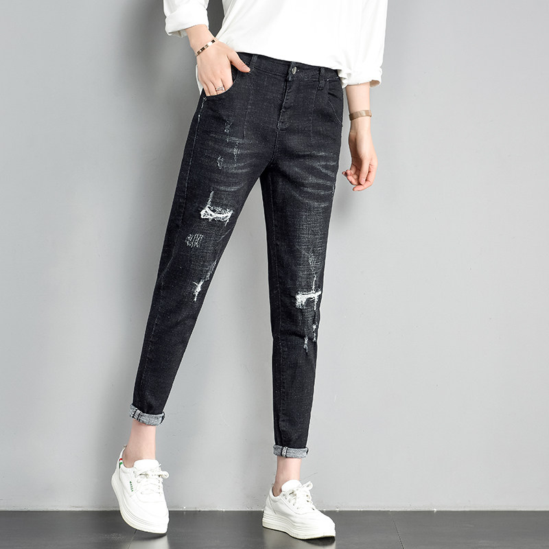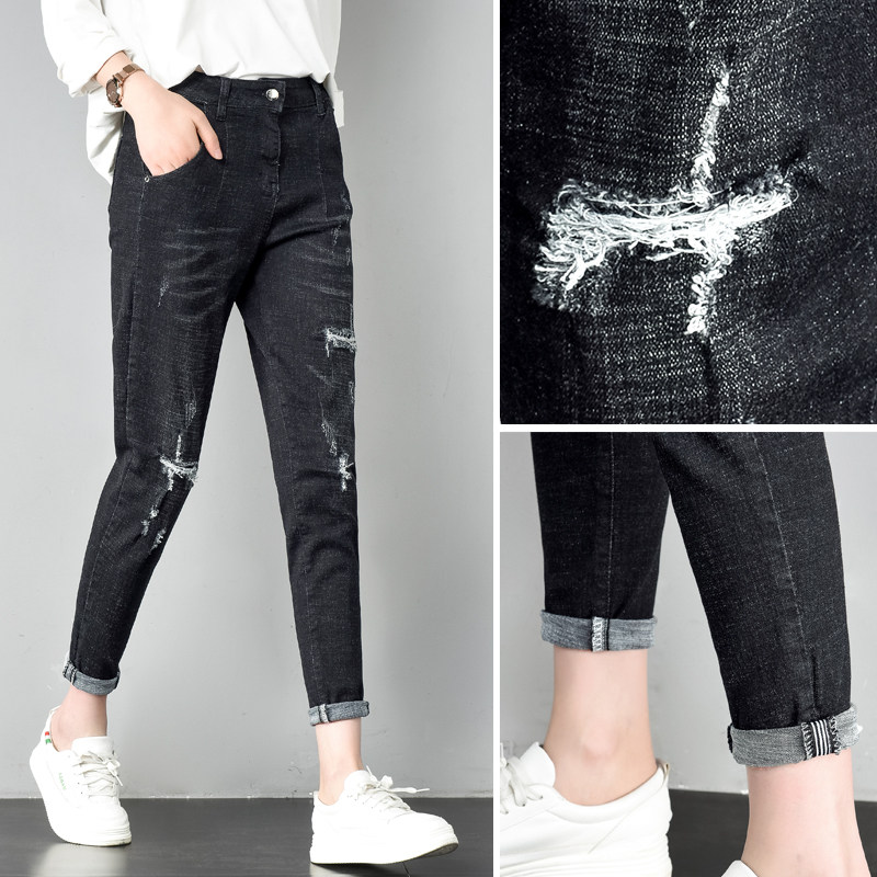 牛仔裤 老爹裤 女新款 小脚萝卜裤 高腰宽松显瘦黑色破洞哈伦裤 实拍
